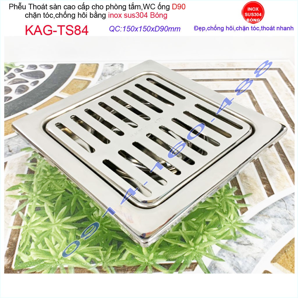 Giới thiệu Phễu thoát sàn 15x15cm KAG-TS84(D9cm) inox 304 ga thoát sàn 15x15cm cho ống 90mm, thoát sàn mặt sọc thoát nhanh chặn tóc