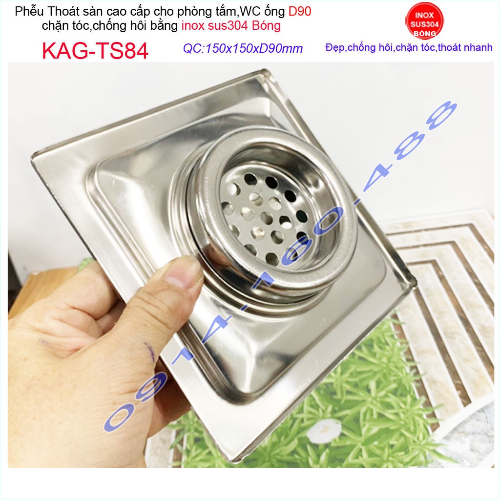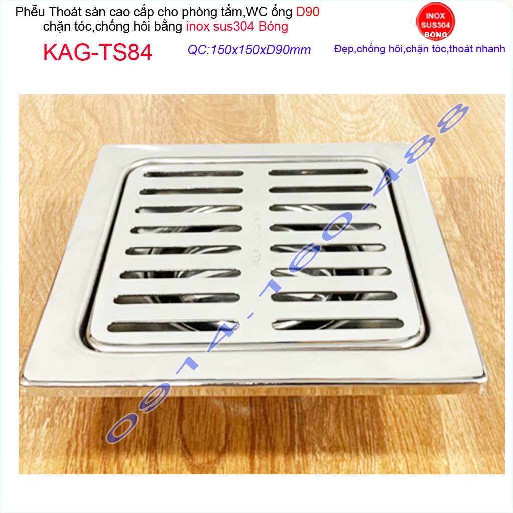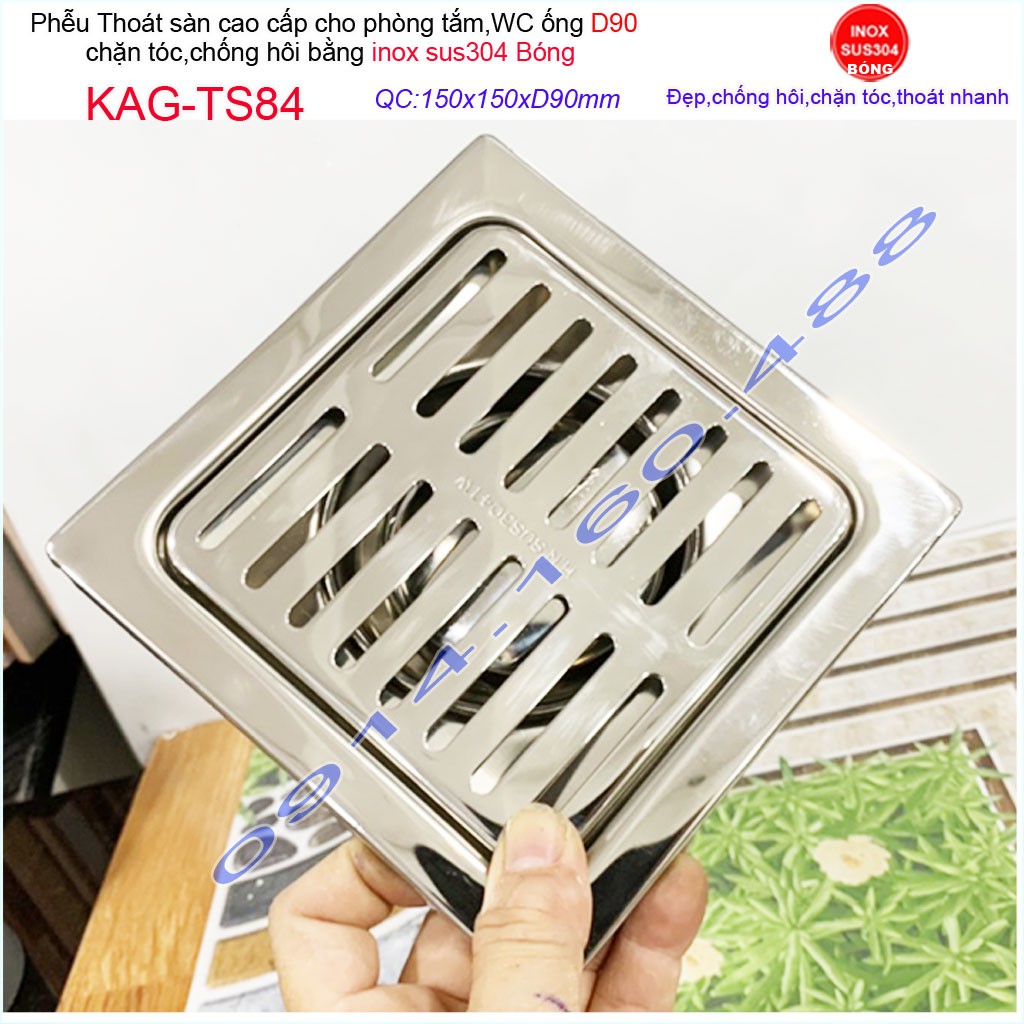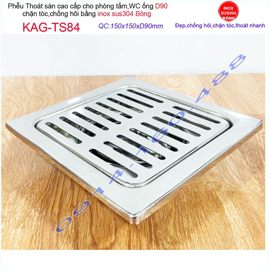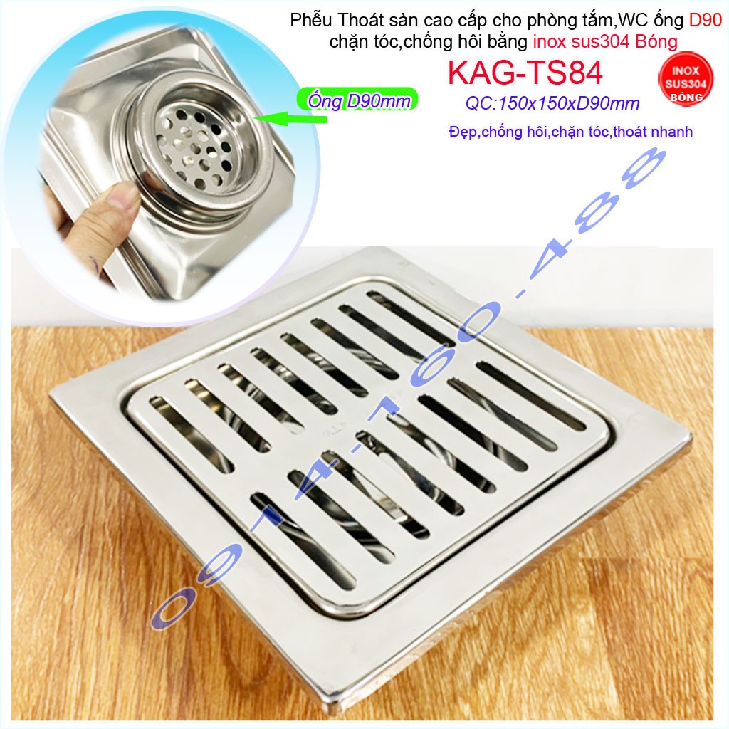 Phễu thoát sàn 15x15cm KAG-TS84(D9cm) inox 304 ga thoát sàn 15x15cm cho ống 90mm, thoát sàn mặt sọc thoát nhanh chặn tóc