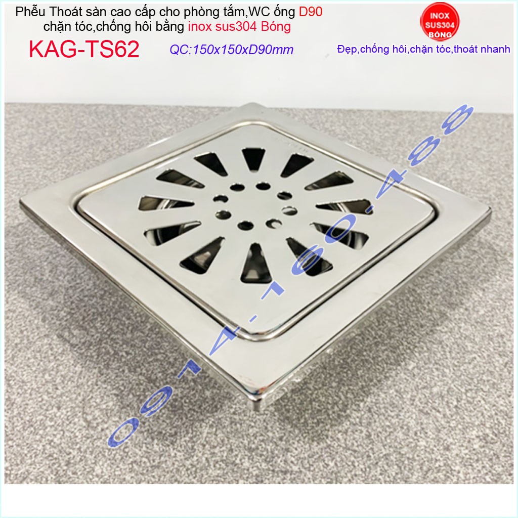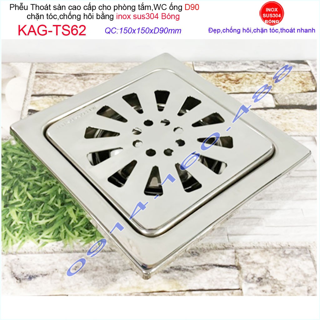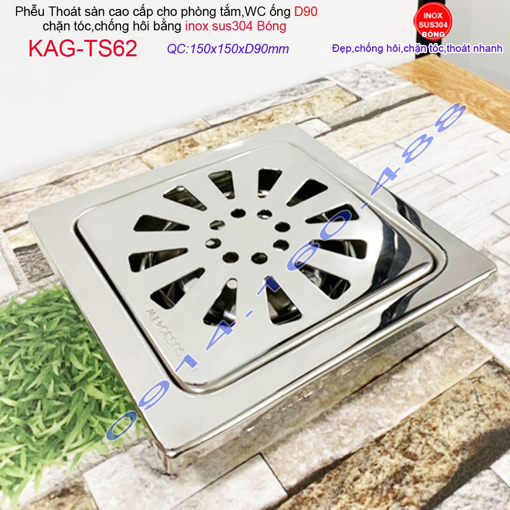 Giới thiệu Phễu thoát sàn 15x15cm KAG-TS62 (D9cm) chống mùi hôi inox 304, hố ga thoát sàn 15x15cm cho ống D90mm mặt hoa cúc