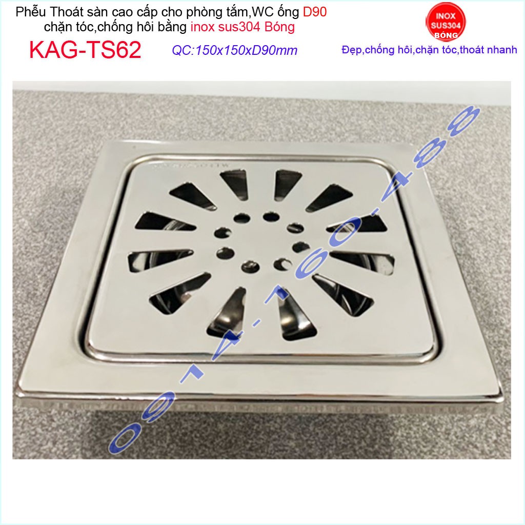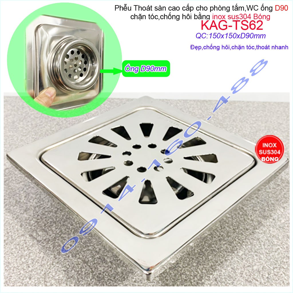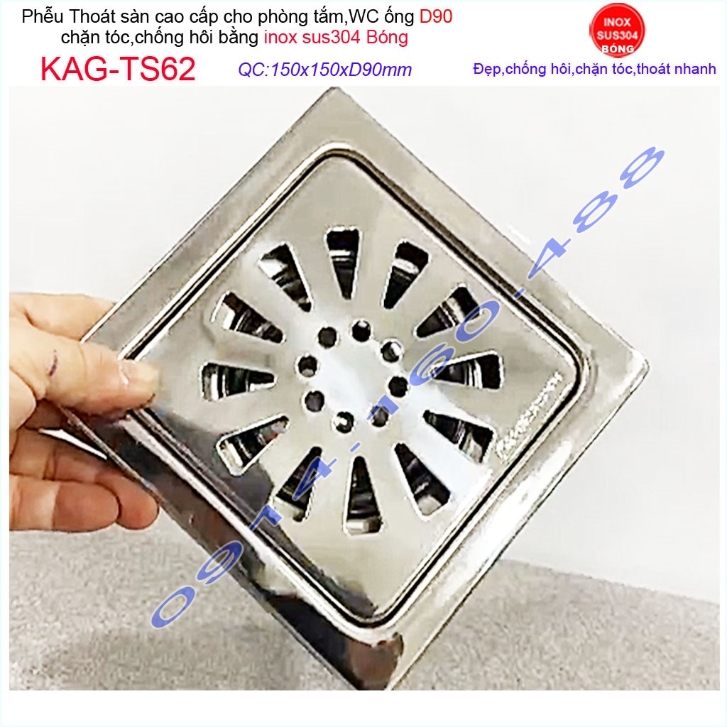 Giới thiệu Phễu thoát sàn 15x15cm KAG-TS62 (D9cm) chống mùi hôi inox 304, hố ga thoát sàn 15x15cm cho ống D90mm mặt hoa cúc