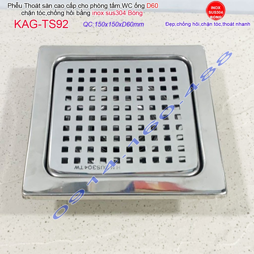 Giới thiệu Phễu thoát sàn 15x15cm KAG-TS92 (D6cm) inox 304, hố ga thoát sàn khách sạn cho ống D60mm mặt caro chống mùi hôi