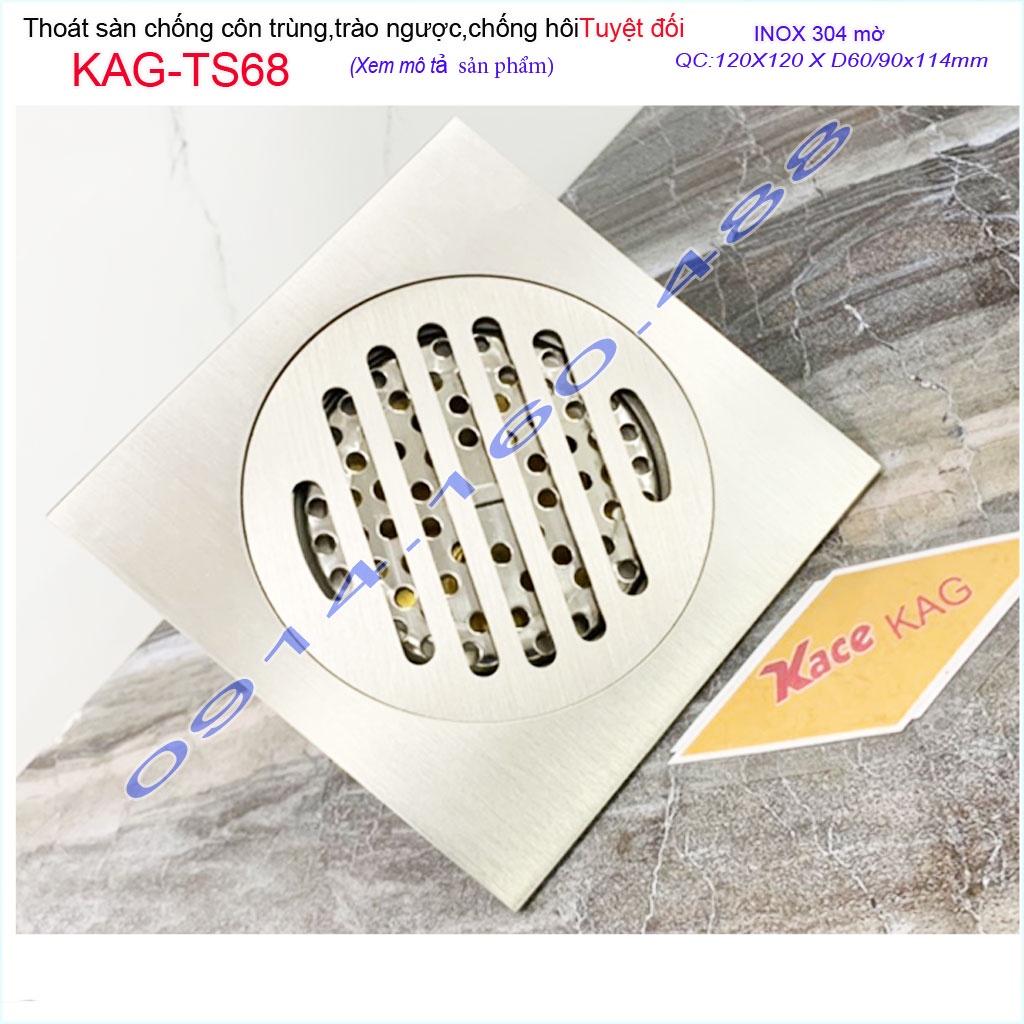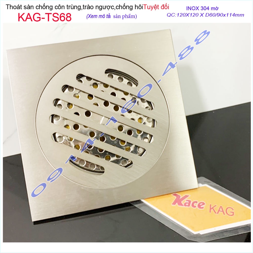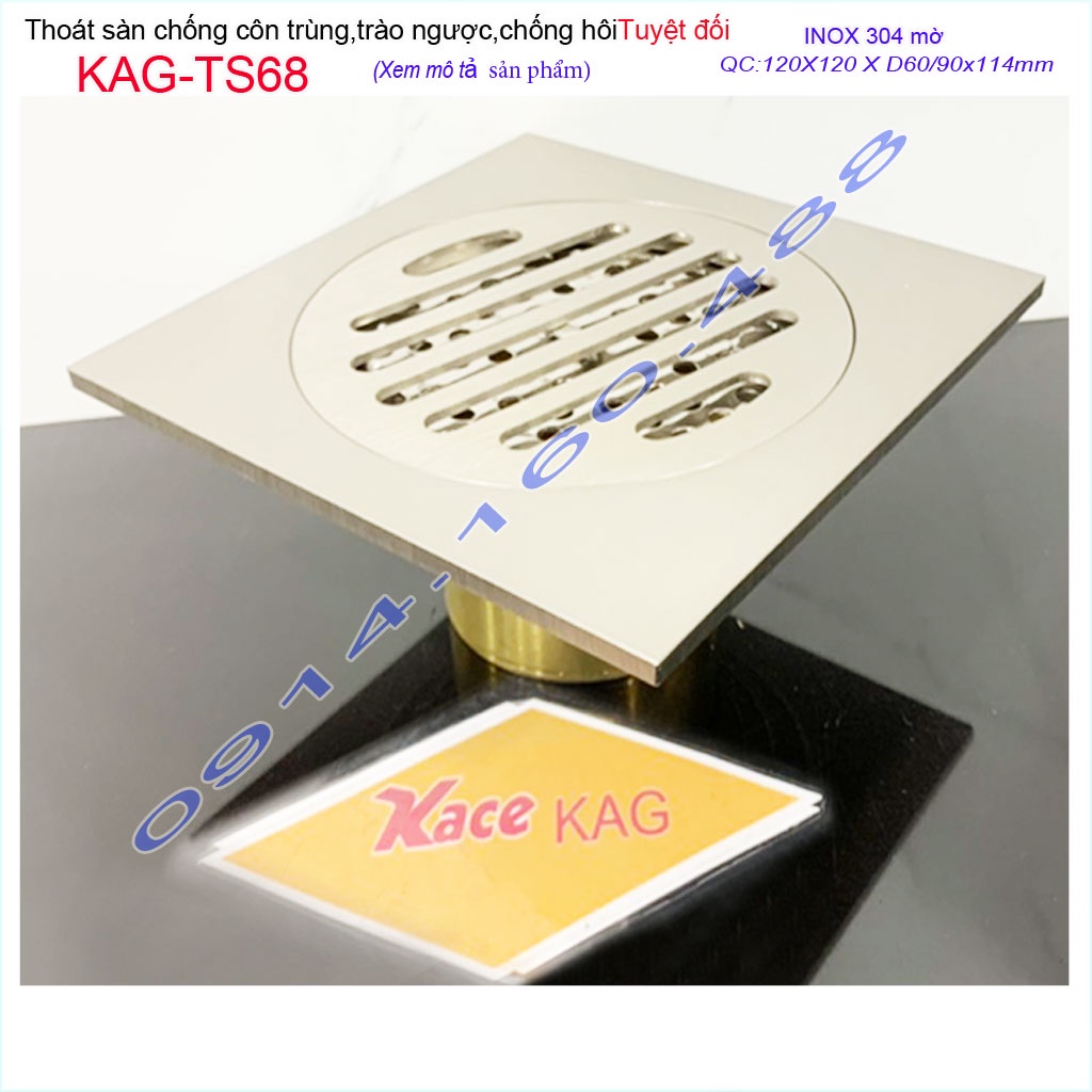 Phễu thoát sàn chống côn trùng KAG-TS68 12x12cm D60-90, thoát sàn chống hôi Inox SUS304 mờ, hố ga thoát sàn chống trào