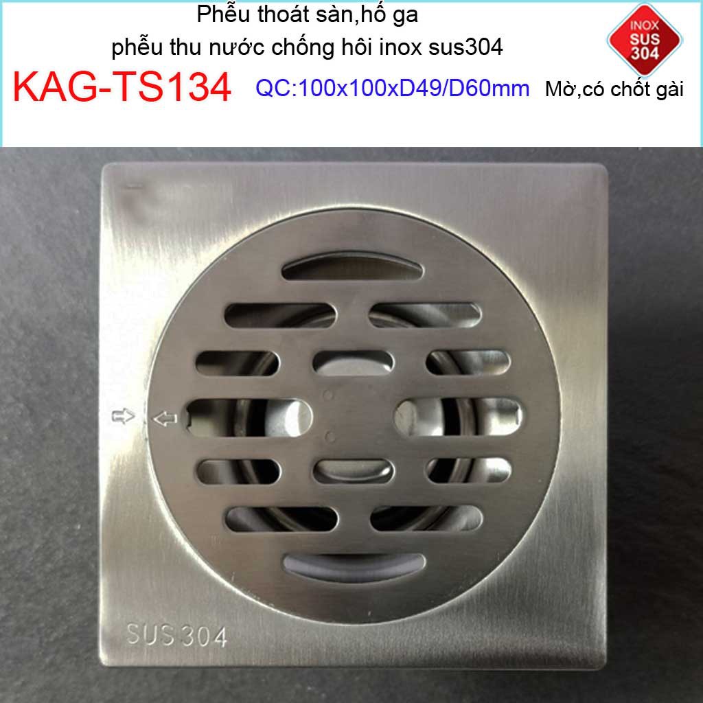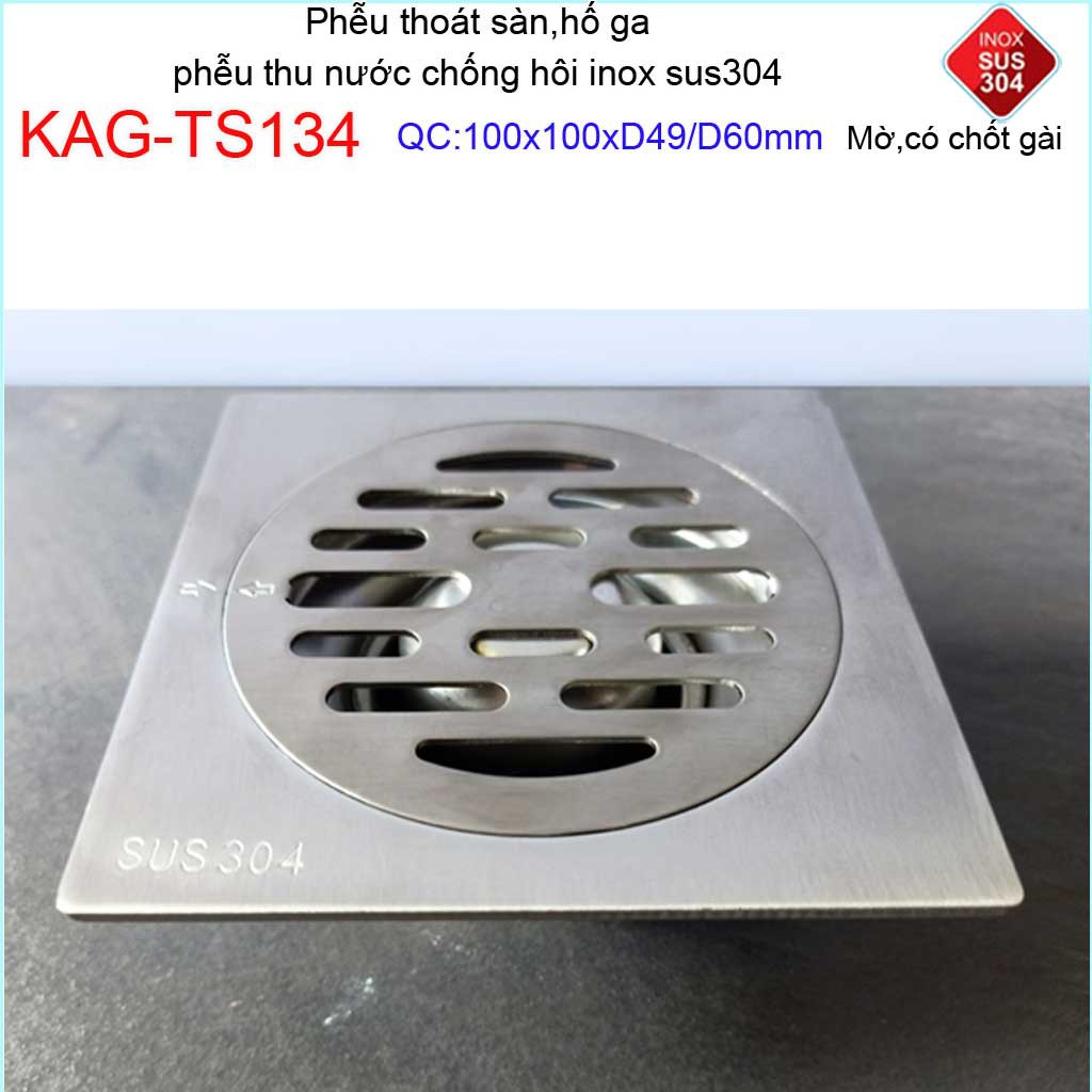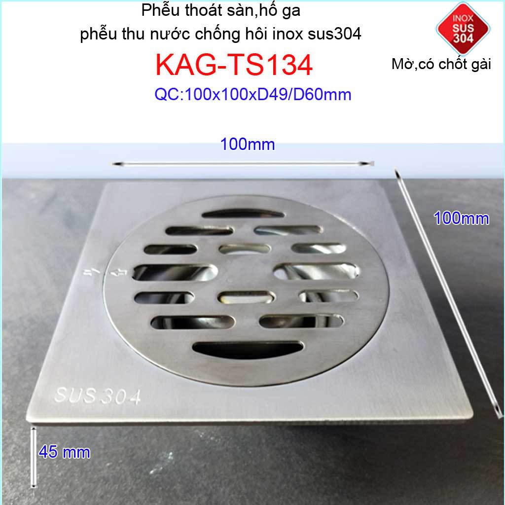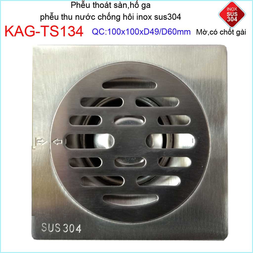 Phễu thoát sàn chống mùi hôi có chốt gài, Phễu thu nước inox 304, thoát sàn Kace 10D60 KAG-TS134Kích thước 100mmx100mm ống D60mm