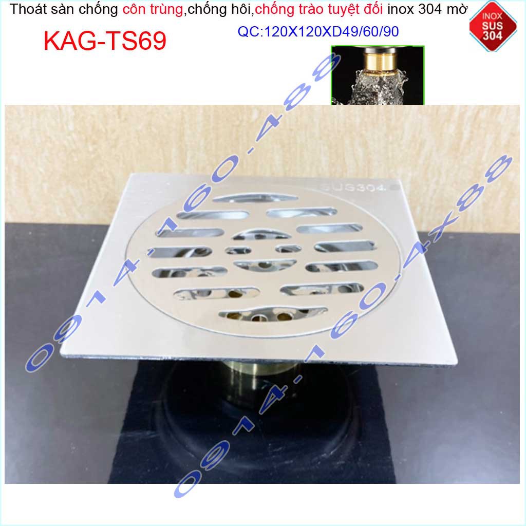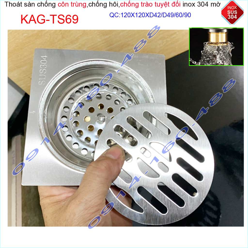 Phễu thoát sàn chống trào ngược KAG-TS69, thoát sàn chống hôi Inox SUS304 mờ, hố ga thoát sàn chống côn trùngKích thước 120mmx120mm ống D60mm/90mm