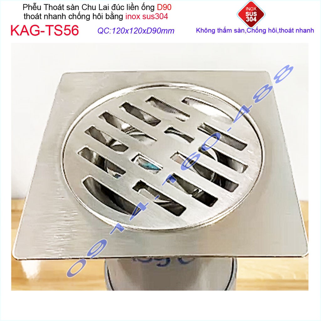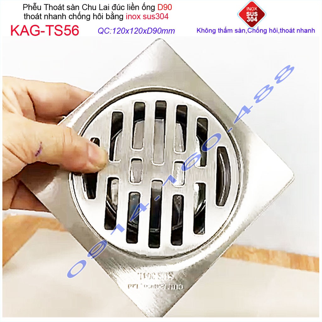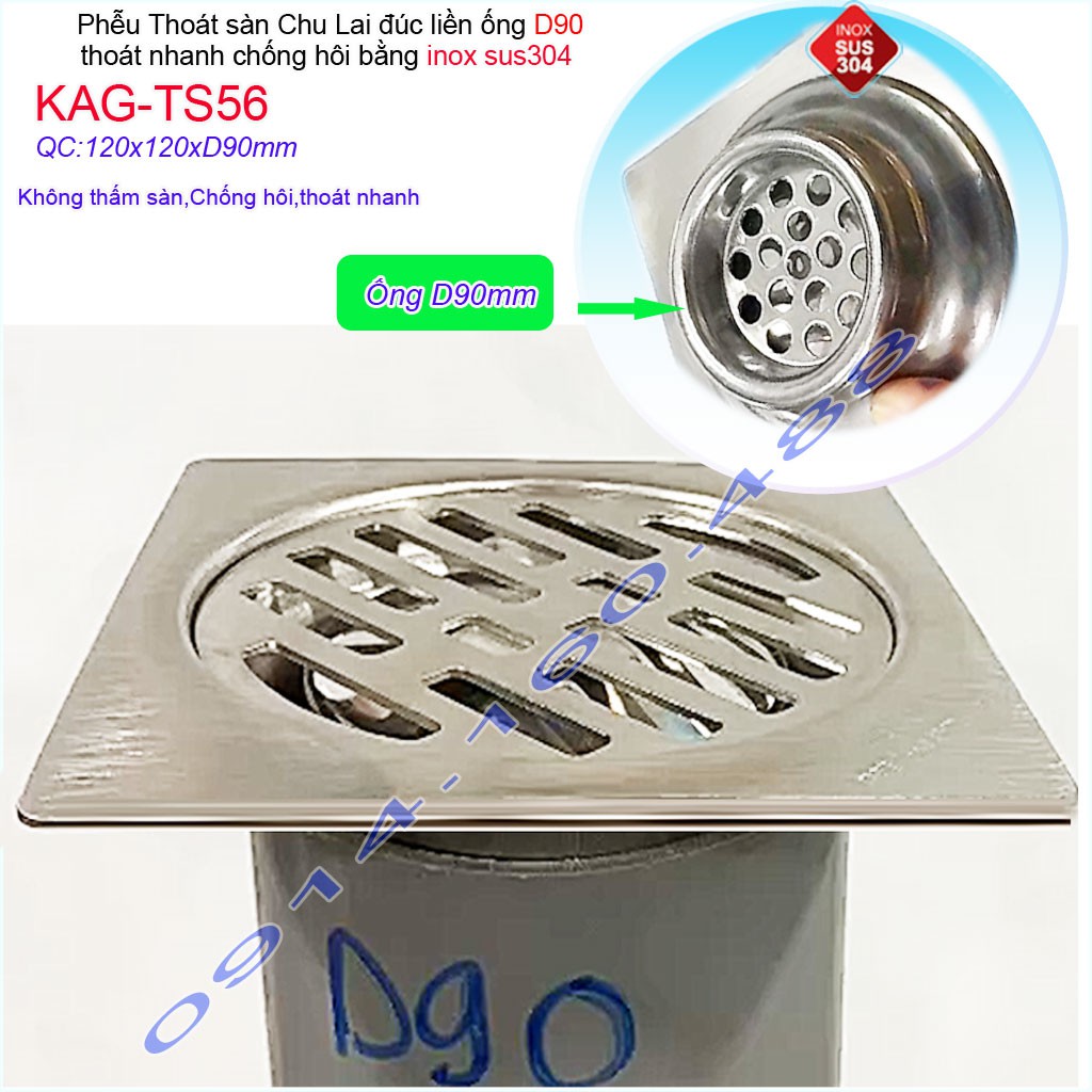 Hố ga thoát sàn Chu lai ống 9cm Inox 304, phễu thoát nước chống hôi 12x12cm ống D90mm KAG-TS56-D90Chất liệu: Inox SUS304 Nhật, Inox dày 1.5mm mờ