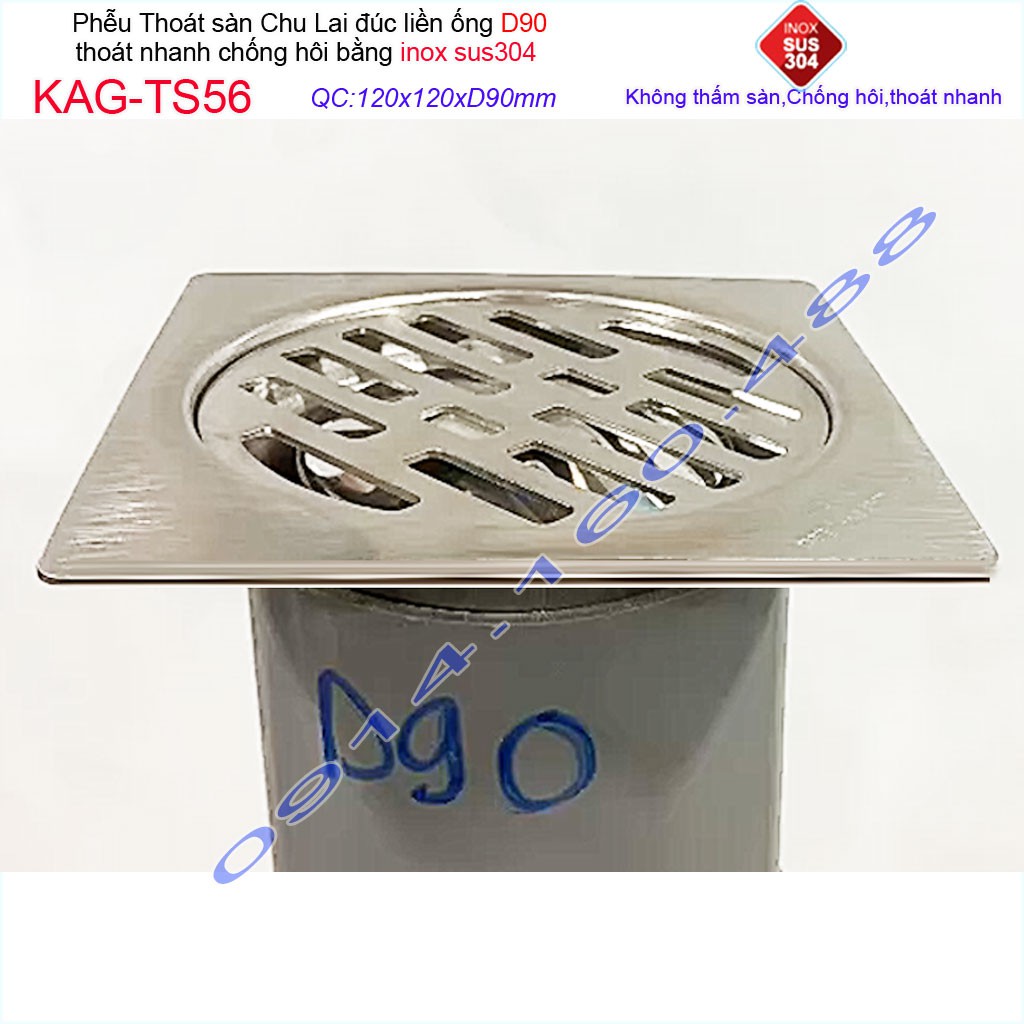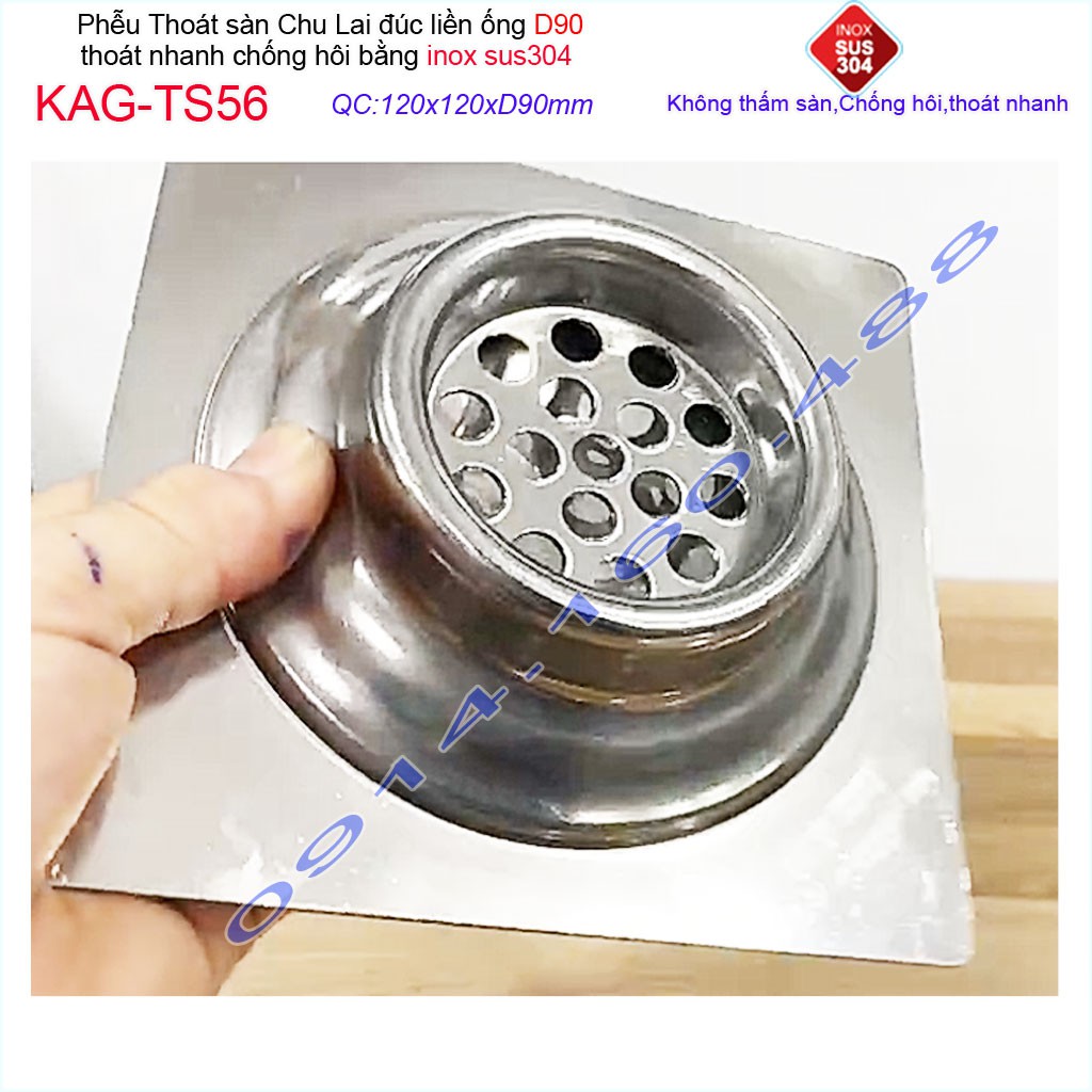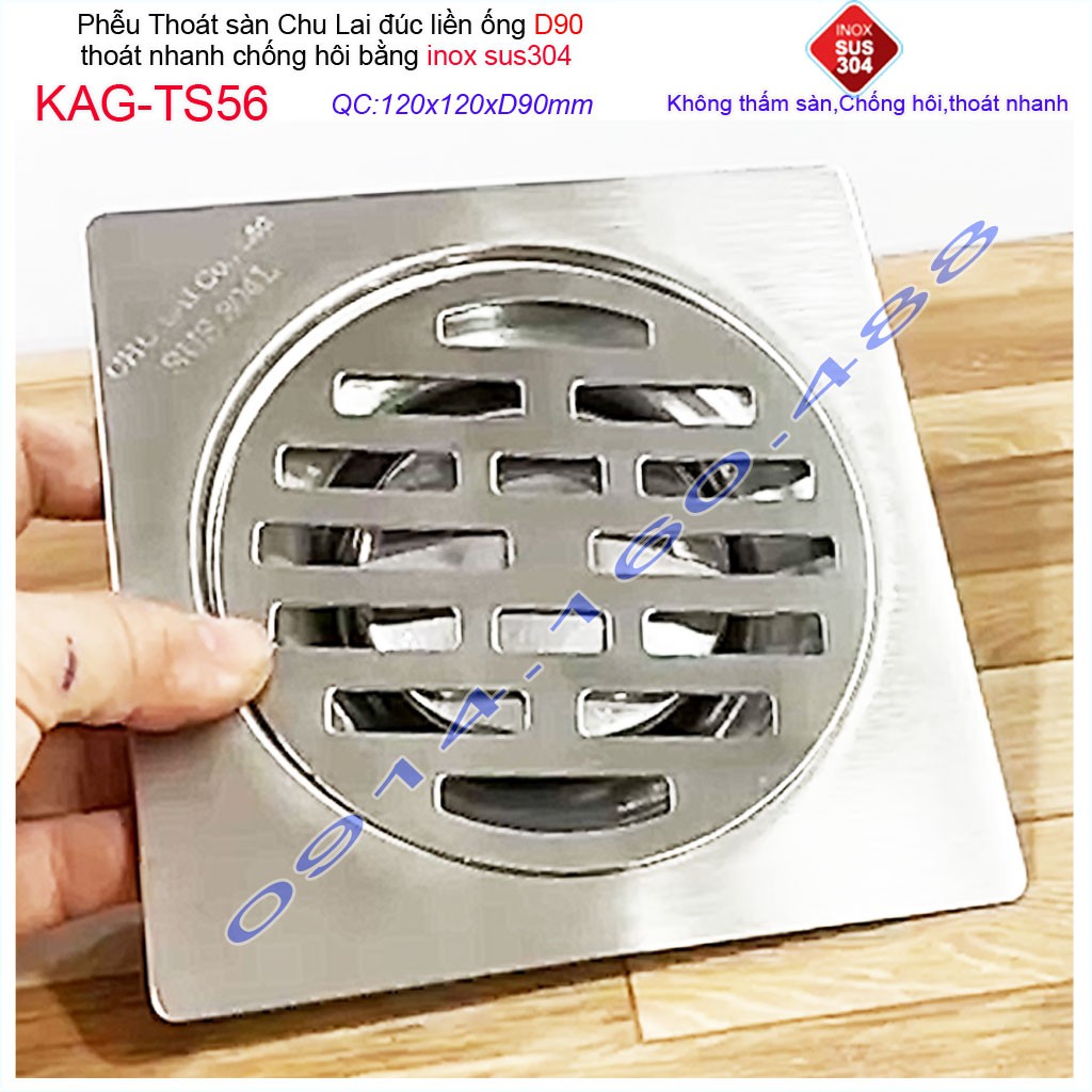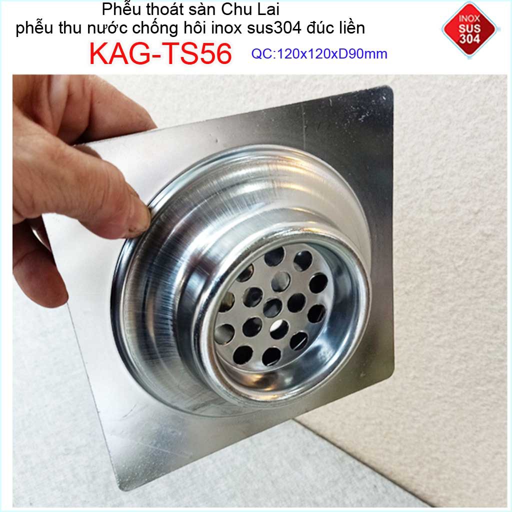 Hố ga thoát sàn Chu lai ống 9cm Inox 304, phễu thoát nước chống hôi 12x12cm ống D90mm KAG-TS56-D90Chất liệu: Inox SUS304 Nhật, Inox dày 1.5mm mờ