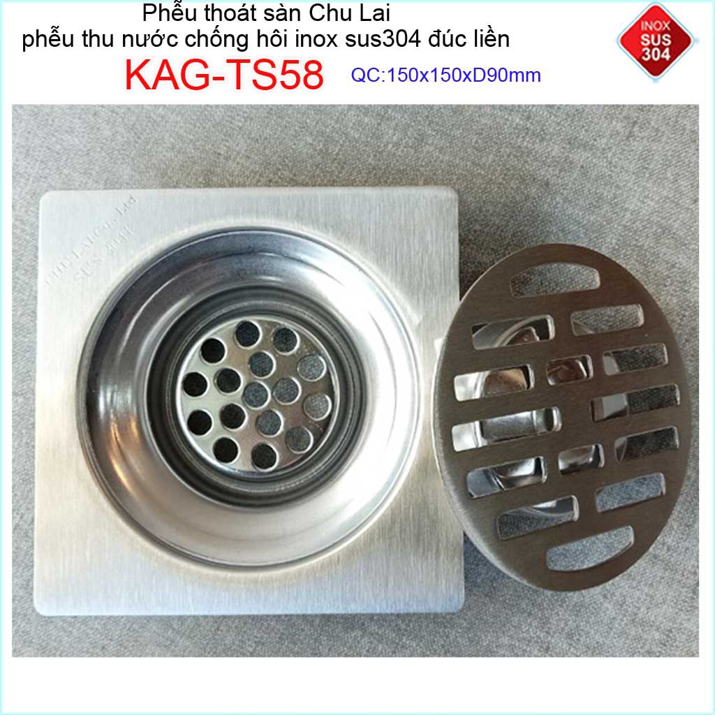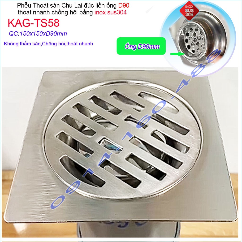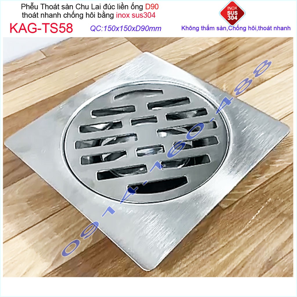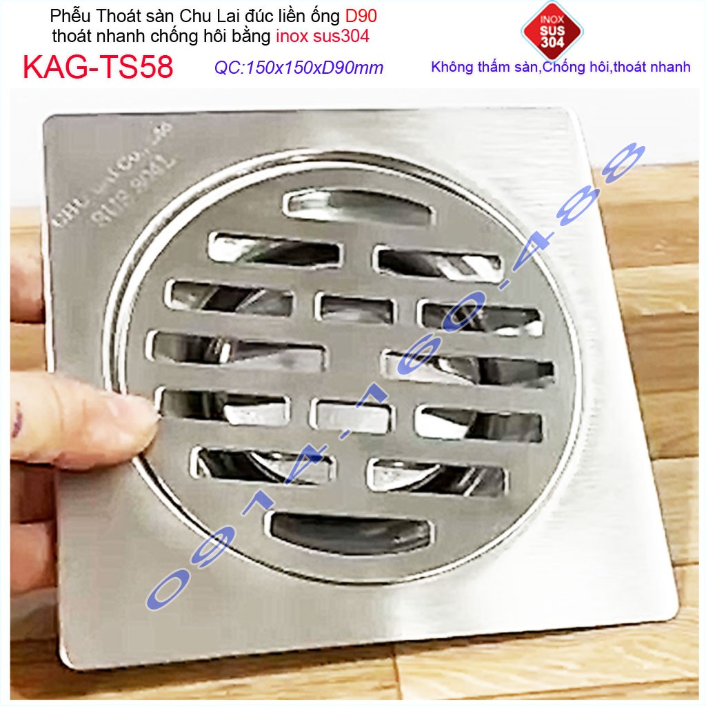 Hố ga thoát sàn Chu lai ống 9cm Inox 304, phễu thoát nước chống hôi 15x15cm ống D90mm KAG-TS58-D90Chất liệu: Inox SUS304 Nhật, Inox dày 1.5mm mờ