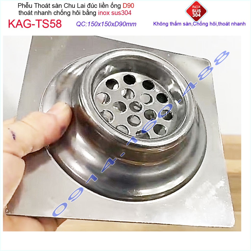 Giới thiệu Phễu thoát sàn Chu Lai 15x15cm KAG-TS58-D90, Hố ga Thoát sàn chống hôi ống 9cm inox 304 đúc dày thoát nhanh chặn tóc tốt