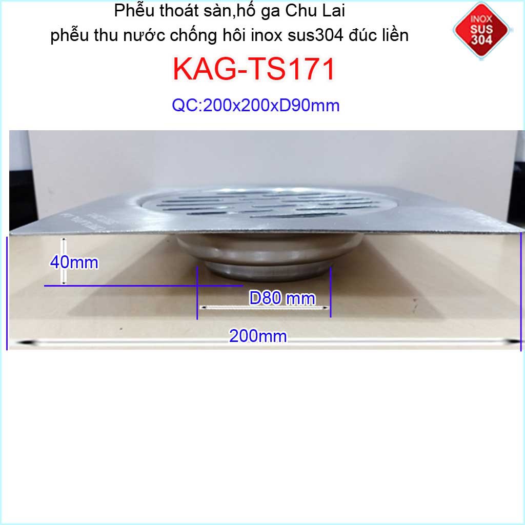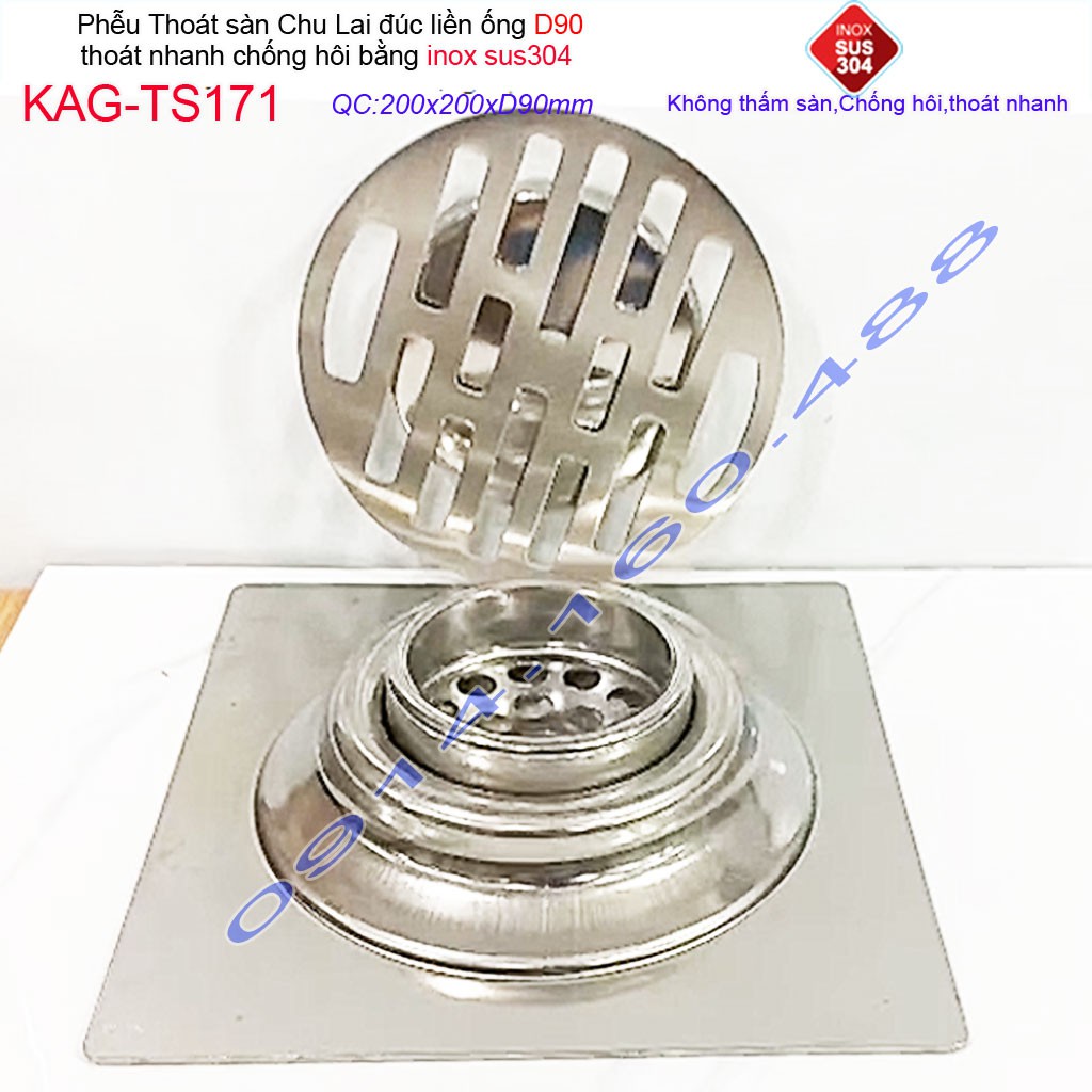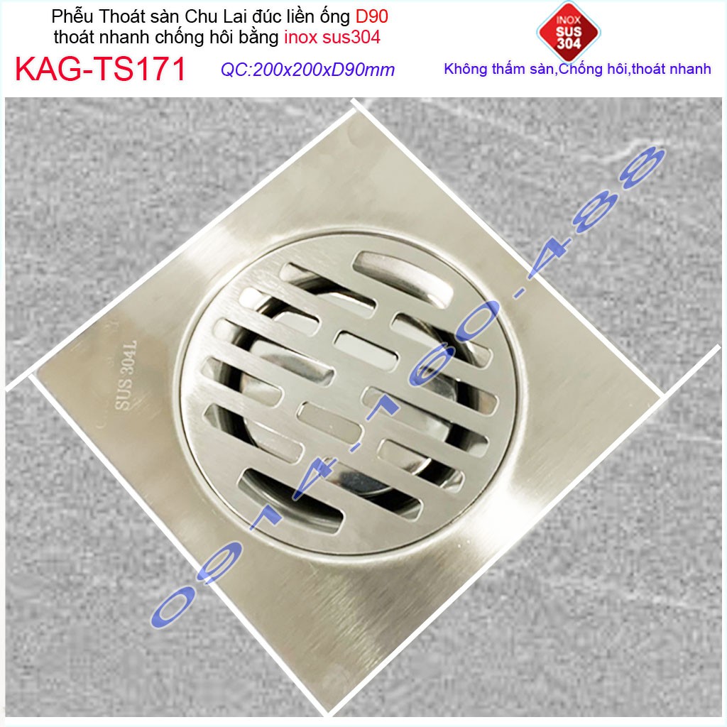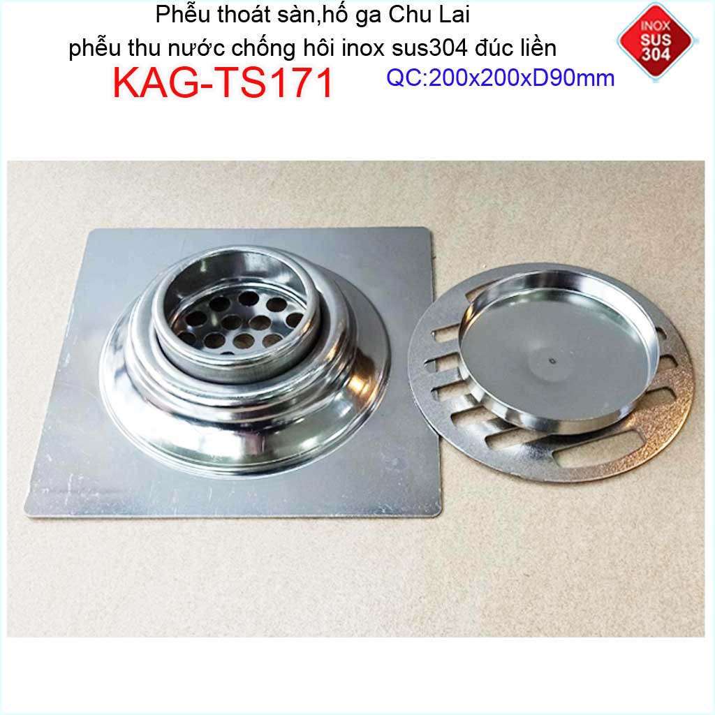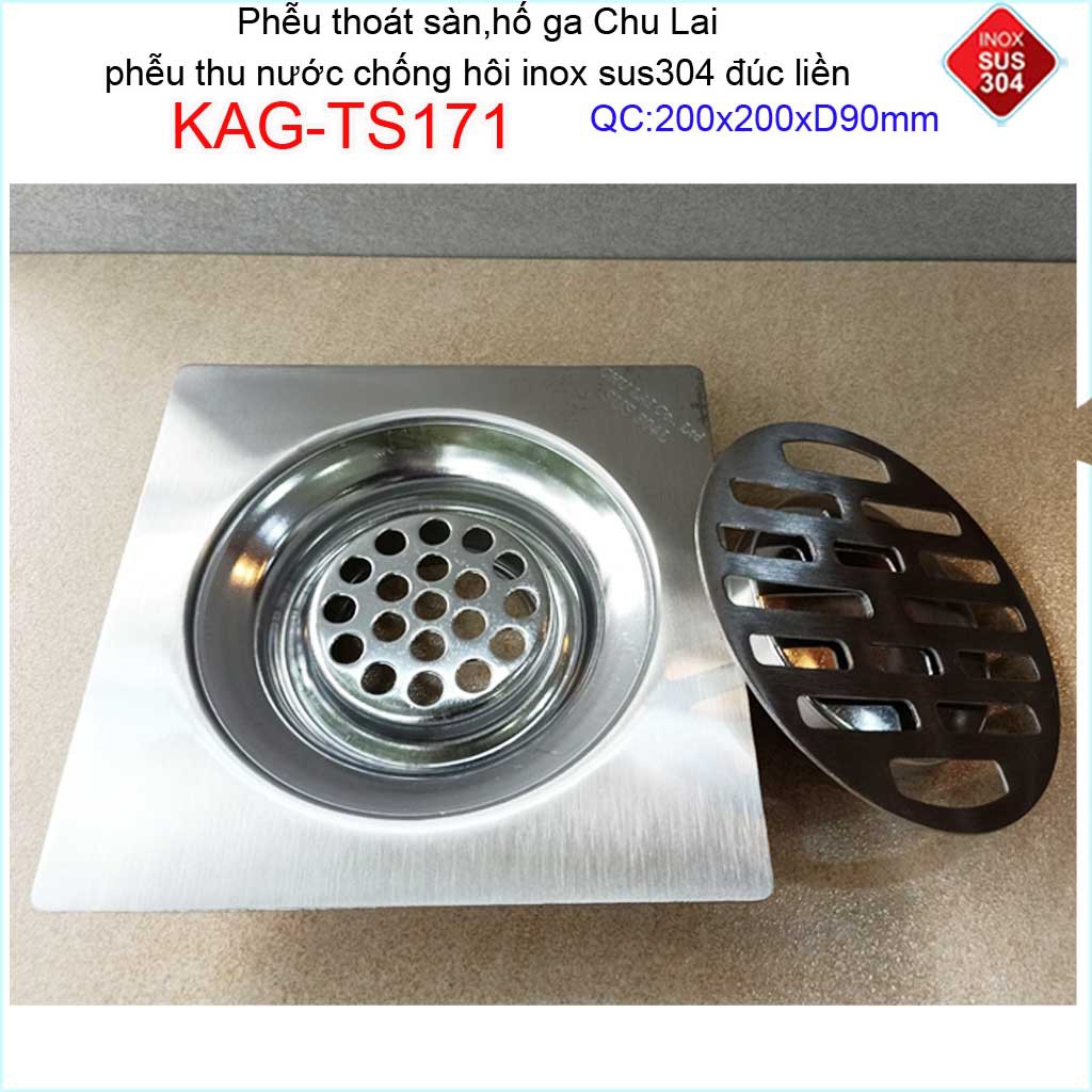 Phễu thoát sàn Chu Lai 20x20cm KAG-TS171-D90, Hố ga thoát sàn ống 9cm SUS304 inox đúc dày thoát nhanh chặn tóc tốtChất liệu: Inox SUS304 Nhật, Inox dày 1.5mm mờ