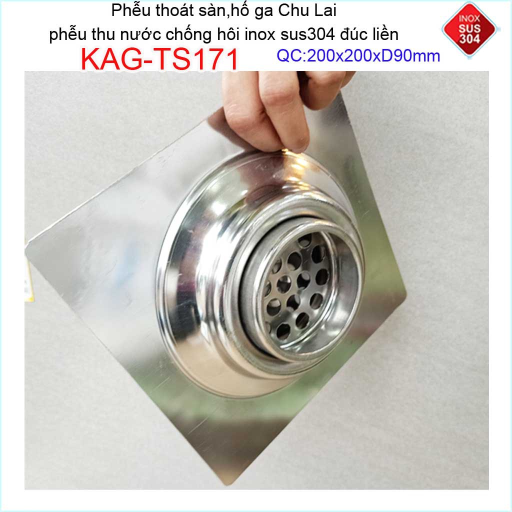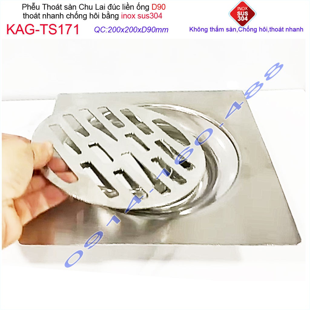 Phễu thoát sàn Chu Lai 20x20cm KAG-TS171-D90, Hố ga thoát sàn ống 9cm SUS304 inox đúc dày thoát nhanh chặn tóc tốt