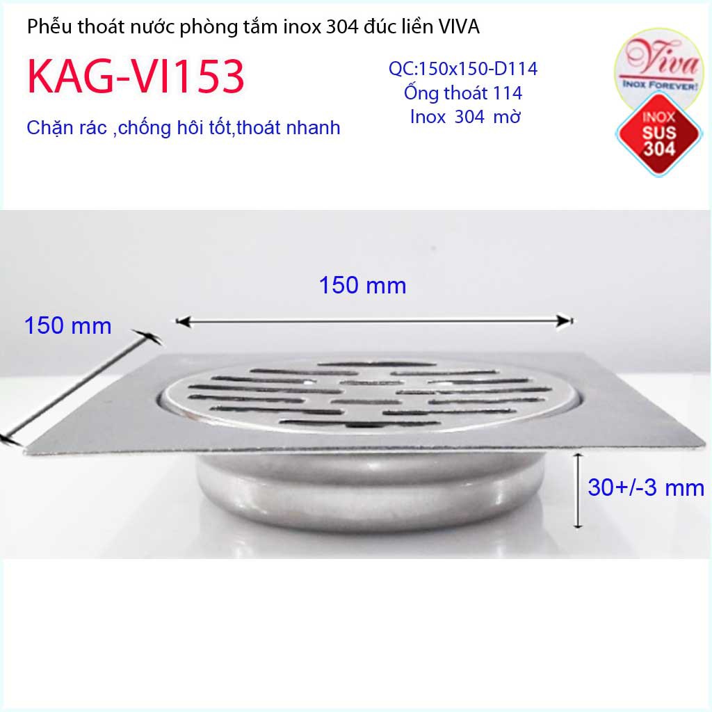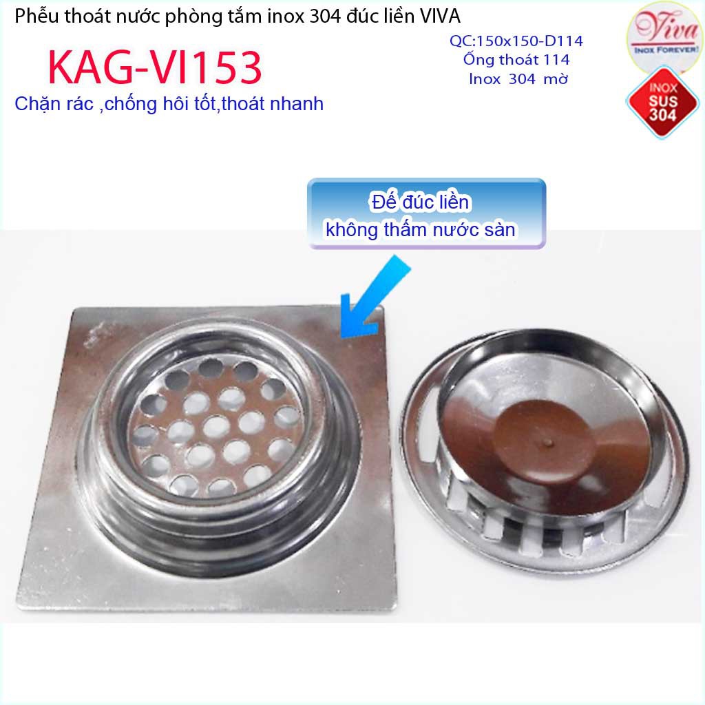 Phễu thoát sàn chống mùi hôi inox 304, thoát sàn Viva 15114 KAG-VI153 sản xuất Inox SUS304 Taiwan cao cấp, công nghệ dập khuôn không hàn tạo nên sản phẩm cao cấp, hàng Việt Nam Chất Lượng Cao