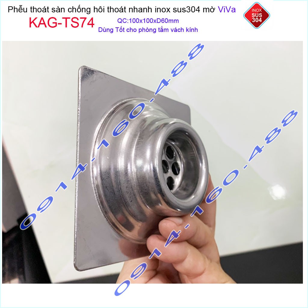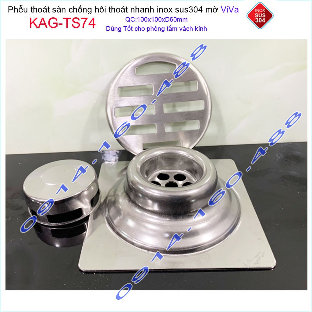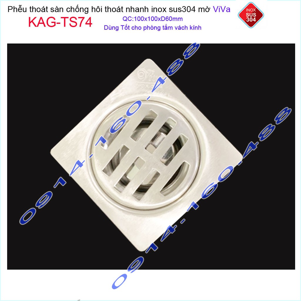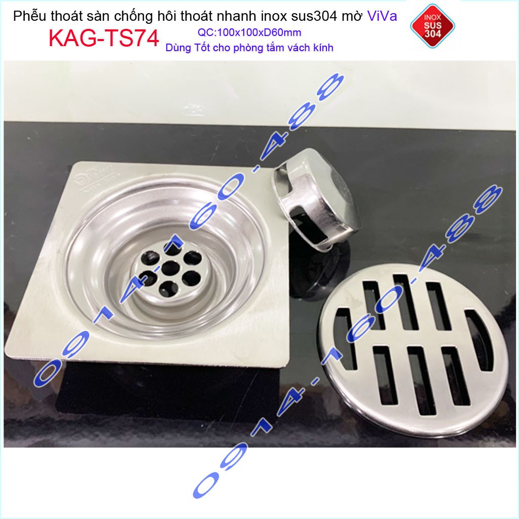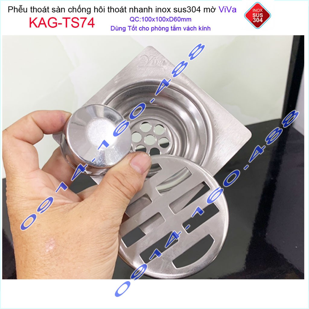 Phễu thoát sàn Viva KAG-TS74 10x10cm D60, phễu thoát sàn SUS304 đúc liền khối sales 40%, hố ga chống hôi inox 304 dày