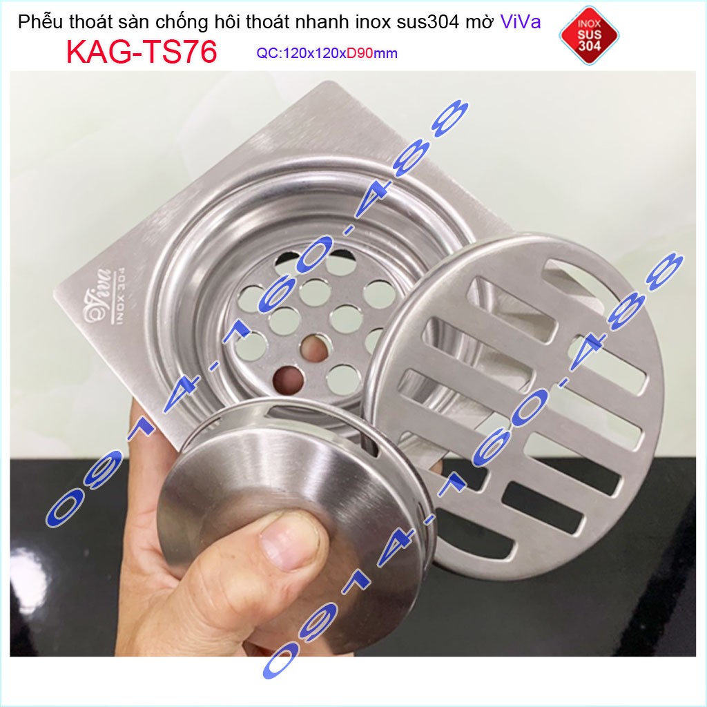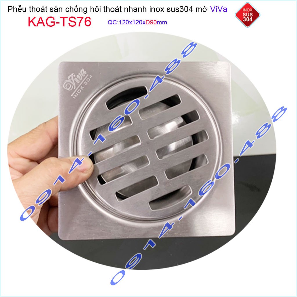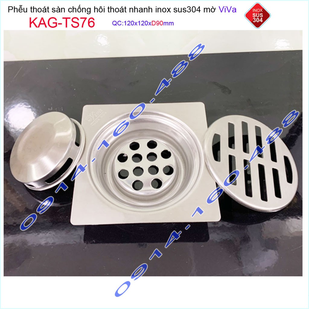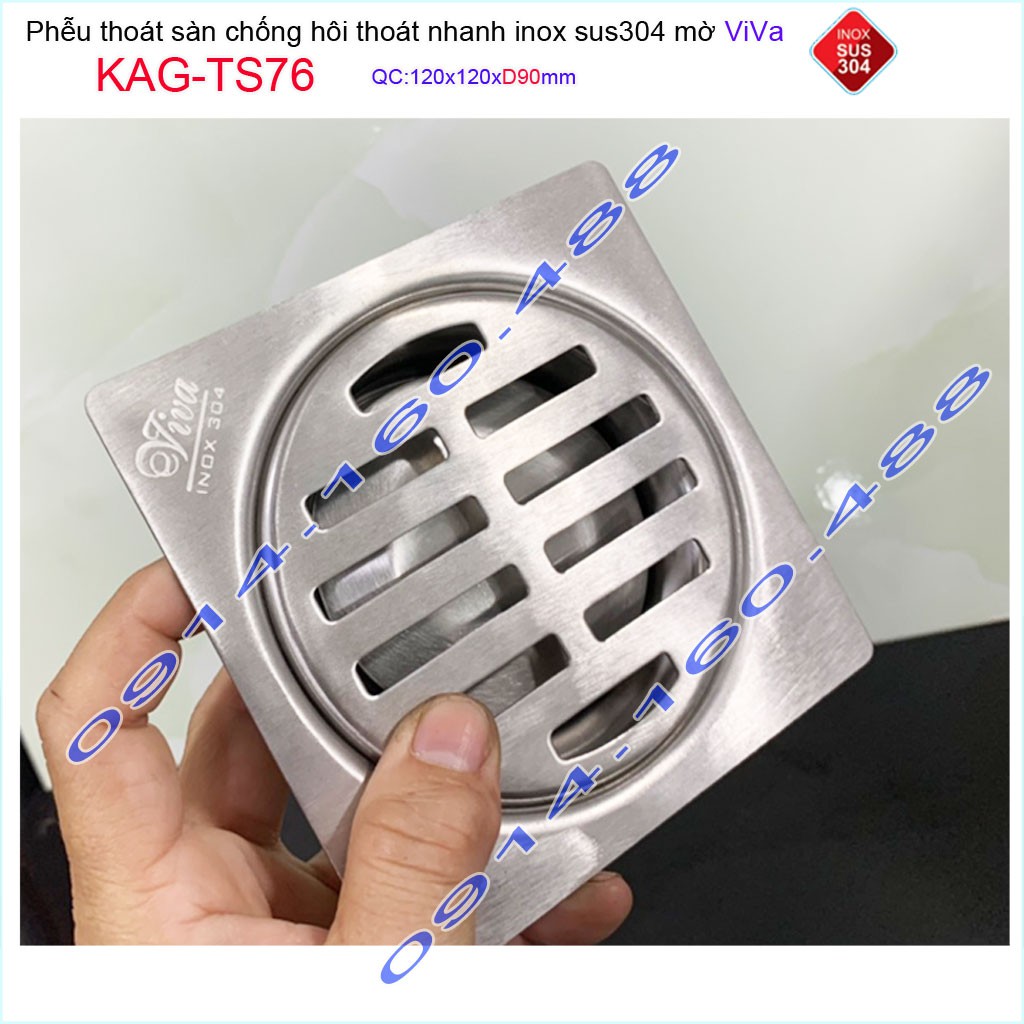Giới thiệu Phễu thoát sàn Viva KAG-TS76 12x12cm D90, phễu thoát sàn SUS304 đúc liền khối sales 40%, hố ga chống hôi inox 304 dày 1.