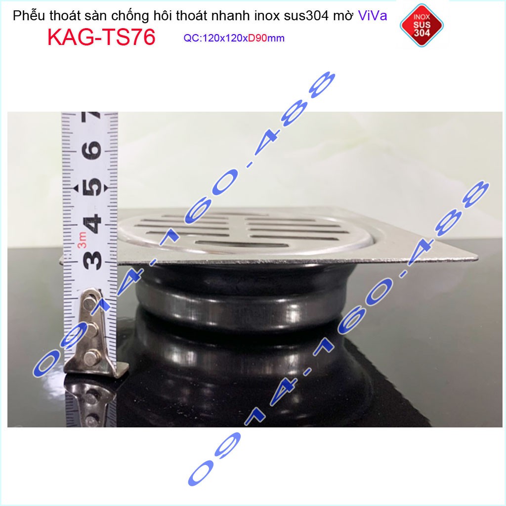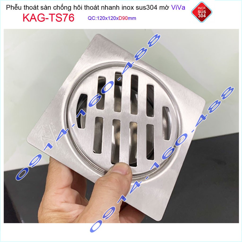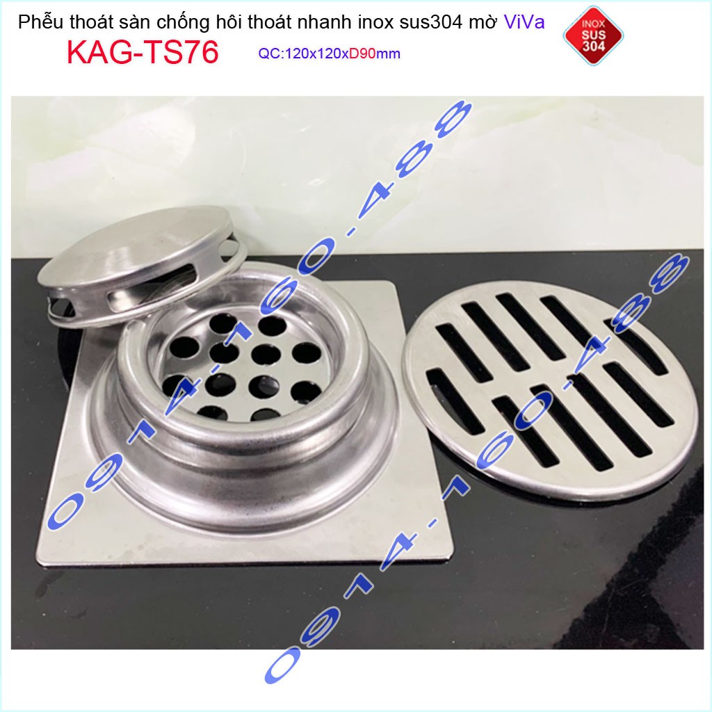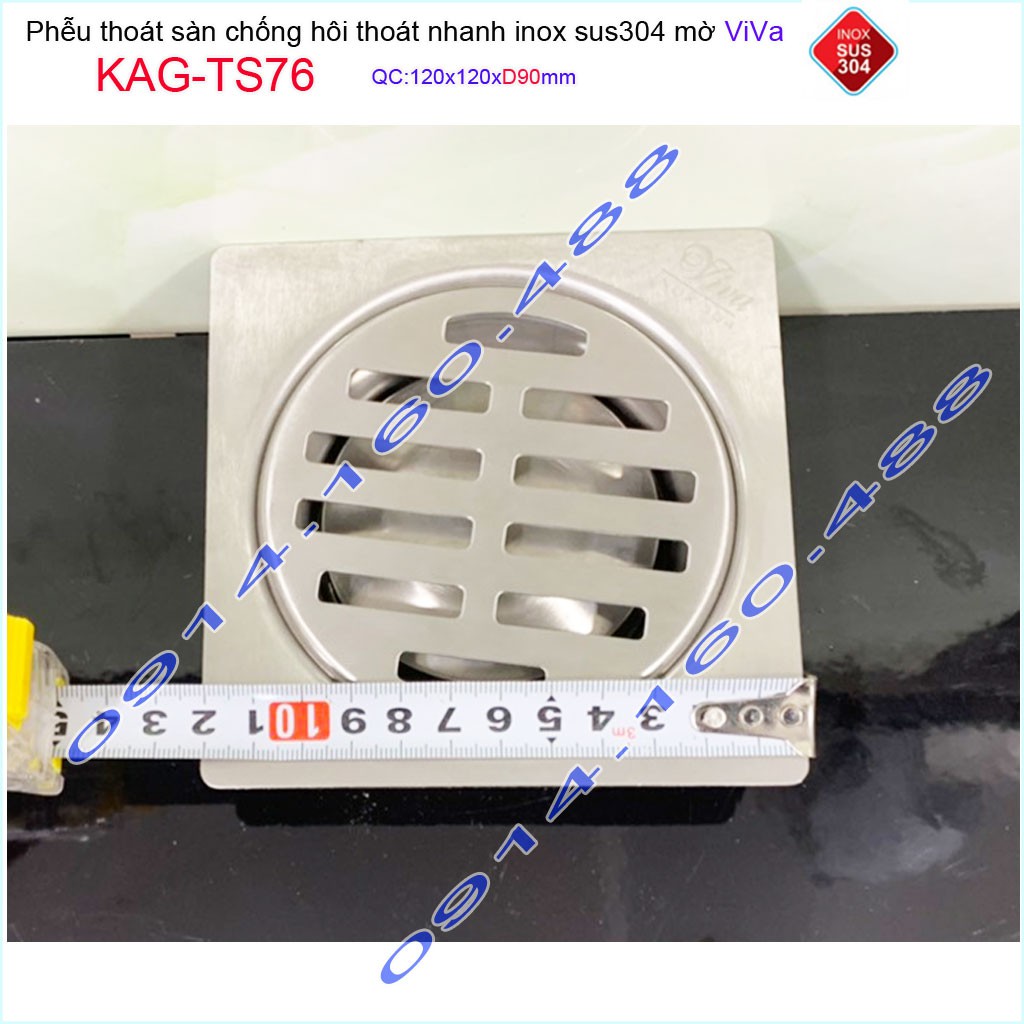 Giới thiệu Phễu thoát sàn Viva KAG-TS76 12x12cm D90, phễu thoát sàn SUS304 đúc liền khối sales 40%, hố ga chống hôi inox 304 dày 1.