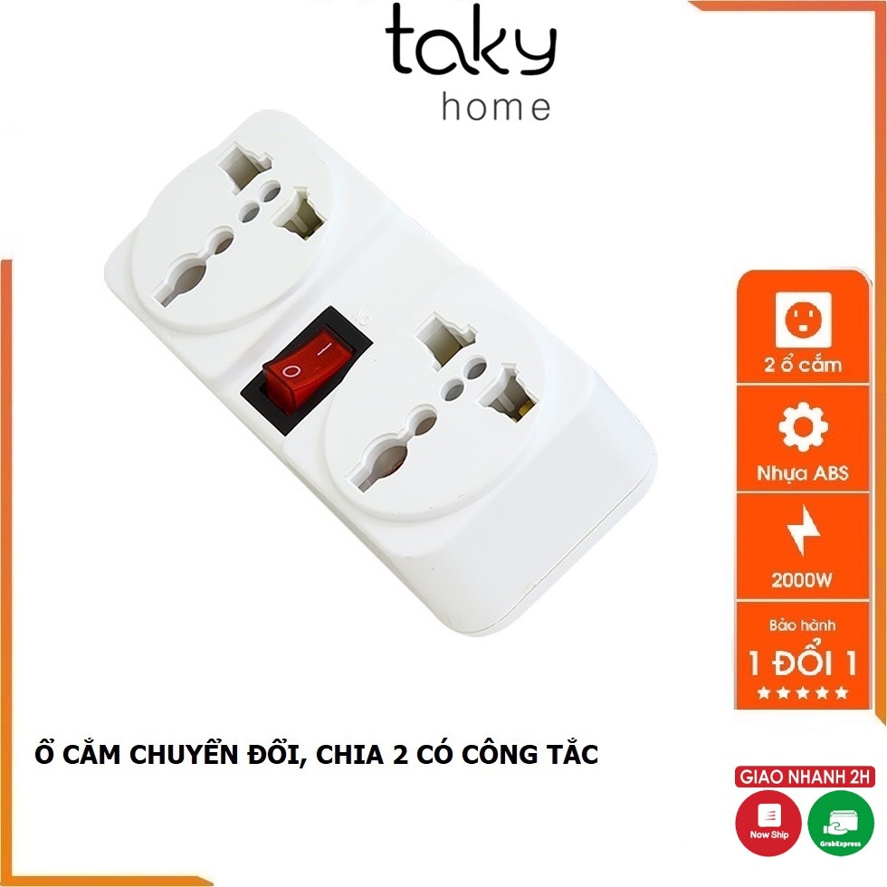 Thiết Bị Điện Gia Dụng > Mạch điện & Phụ tùng > Ổ cắm điện & Dây nối || Phích Cắm Chia 2 Ổ Cắm Kèm Công Tắc, Chuyển Từ 1 Ổ Sang 2 Ổ 3 Chấu, Công Suất 2000W, ABS chống cháy - TakyHome 8606Còn hàng