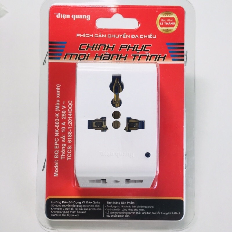 + Đặc biệt, với chất liệu được làm từ nhựa ABS nguyên sinh chống cháy, cứng cáp, phích cắm chuyển đổi đa năng Điện Quang có thể chịu được công suất lớn ( max 2500w), phù hợp với thiết bị điện, máy gia dụng nhập khẩu công suất lớn.