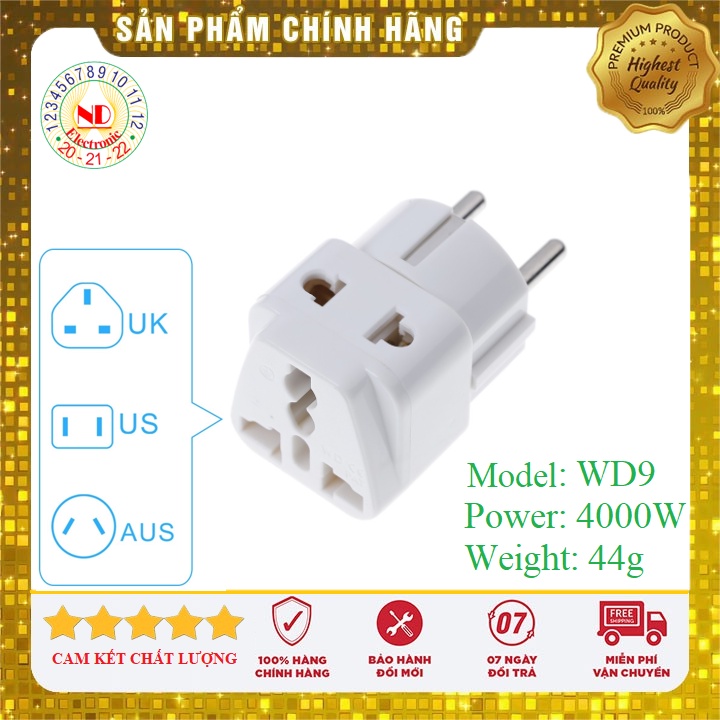 Giới thiệu Phích cắm chuyển đổi WD9 [CHỊU TẢI LÊN TỚI 4000W] 3 chân chuẩn ANH, ÚC, MỸ, NHẬT sang 2 chân tròn 4.8mm Chuẩn VN