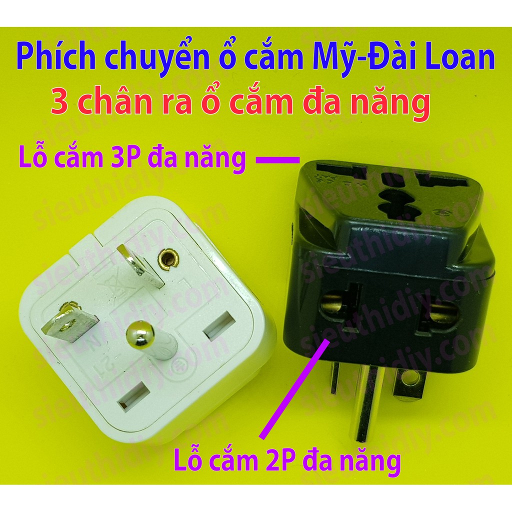 Phích chuyển ổ Đài Loan-Mỹ 3P ra ổ cắm đa năng:- Chuyên dùng để chuyển từ ổ cắm chuẩn Đài Loan-Mỹ dạng 3P: 1 tròn - 1 dẹt dọc - 1 dẹt ngang ra 1 ổ cắm đa năng 3P hoặc 2 ổ ( 1 ổ đa năng 2P + 1 ổ đa năng 3P ).