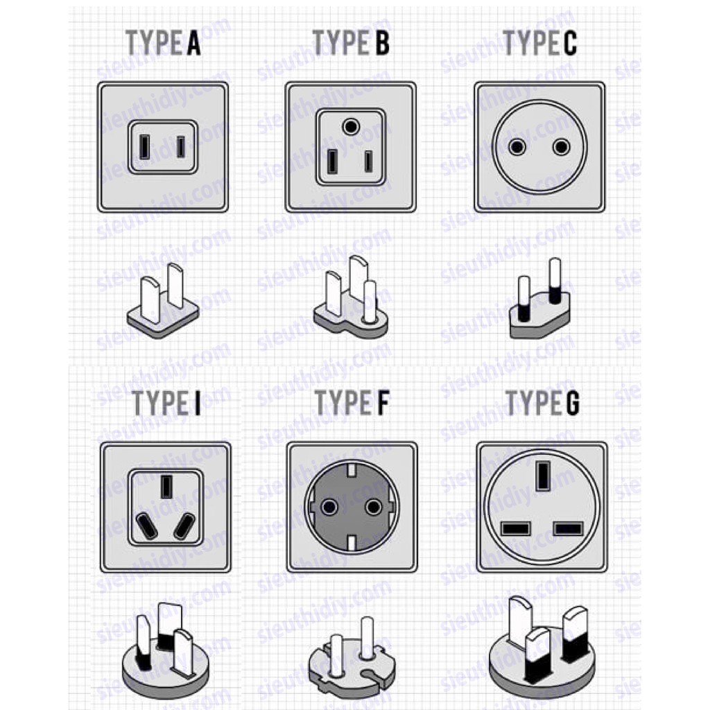 - Ổ cắm đa năng hỗ trợ các chuẩn phích cắm như hình minh họa ( xem hết hình ).