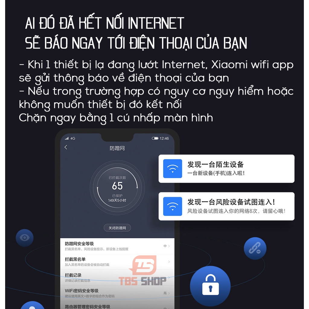 > App MiWifi của Xiaomi, bạn hòan toàn có thể quản lí mọi hoạt động của bộ định tuyến từ xa, kiểm tra tốc độ tải về, cài đặt thời gian hoặc điều chỉnh băng thông cho phù hợp. Đặc biệt, khi có thiết bị lạ kết nối với mạng, sẽ có thông báo trên ứng dụng về quyền truy cập và bạn sẽ chủ động cho phép hoặc ngăn chặn thiết bị đó.
