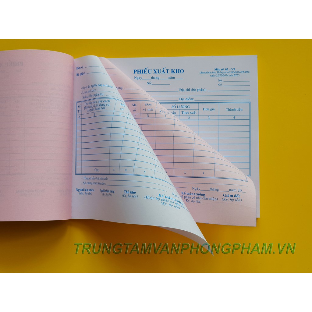 Phiếu xuất kho 2 liên 16x20cm mẫu số 02 VT ban hành thông tư số 200/2014/TT-BTC ngày 22/12/2014 của BTCGiấy Carbonless chất lượng cao ghi rõ liên thứ 2.