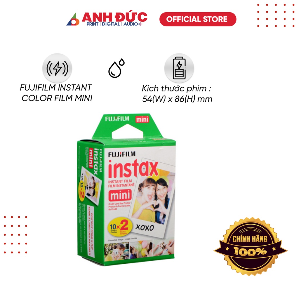 Một hộp có 20 phim, mỗi tấm phim có kích thước 54 x 86 mm, dùng cho các loại máy chụp lấy liền như Fujifilm Instax Mini 7s, Mini 25, Mini 50s.