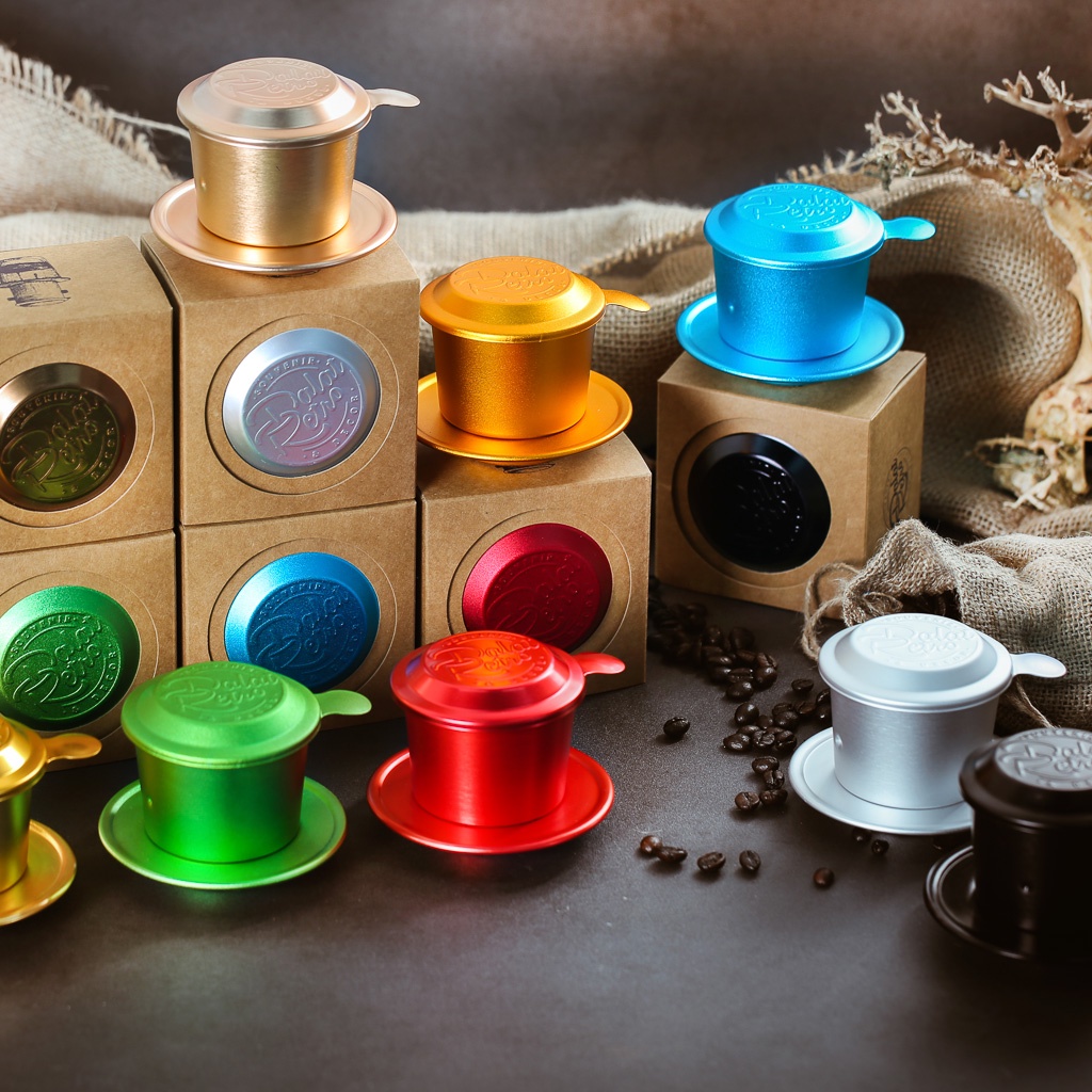 Giới thiệu Phin cà phê Dalat Retro, bộ, mẫu nhôm anode xước, màu amber gold