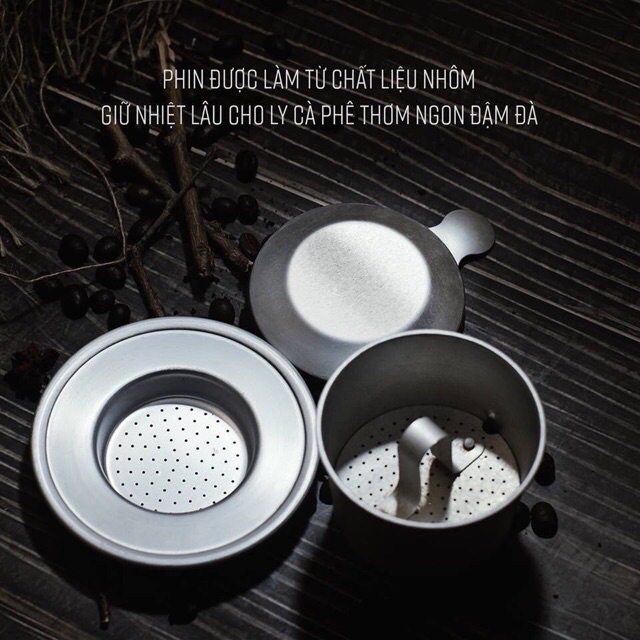 Phin nhôm có nắp gài và có thể tháo lắp dễ dàng sẽ tăng độ nén cho cà phê bằng cách vặn ốc theo chiều kim đồng hồ. Điều này làm cho cafe sạch hơn khi rót nước sôi nóng.