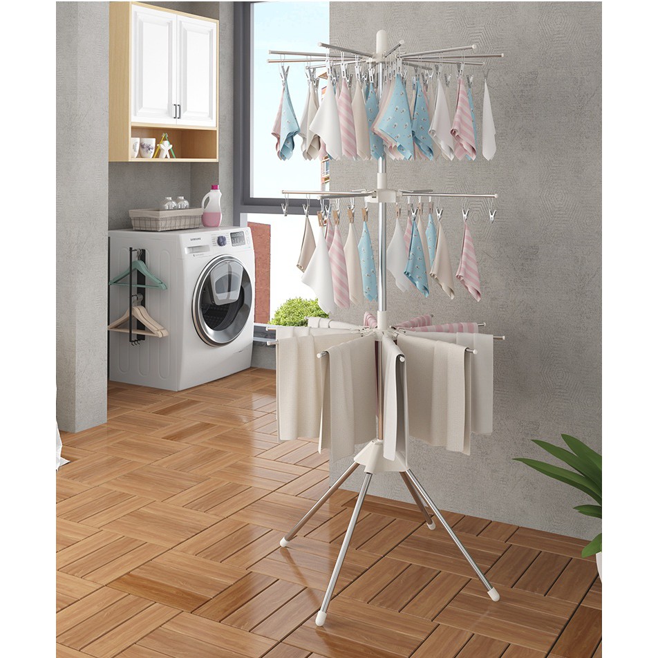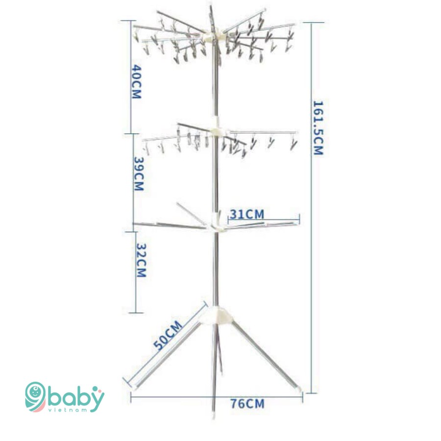 Cây phơi đồ đa năng inox loại 56 kẹp cổ xoay 360 độ gấp gọn- Cây phơi quần áo 3 tầng với 3 giá phơi đồ cực kì chắc chắn và tiện dụng, có thể gập gọn khi không sử dụng