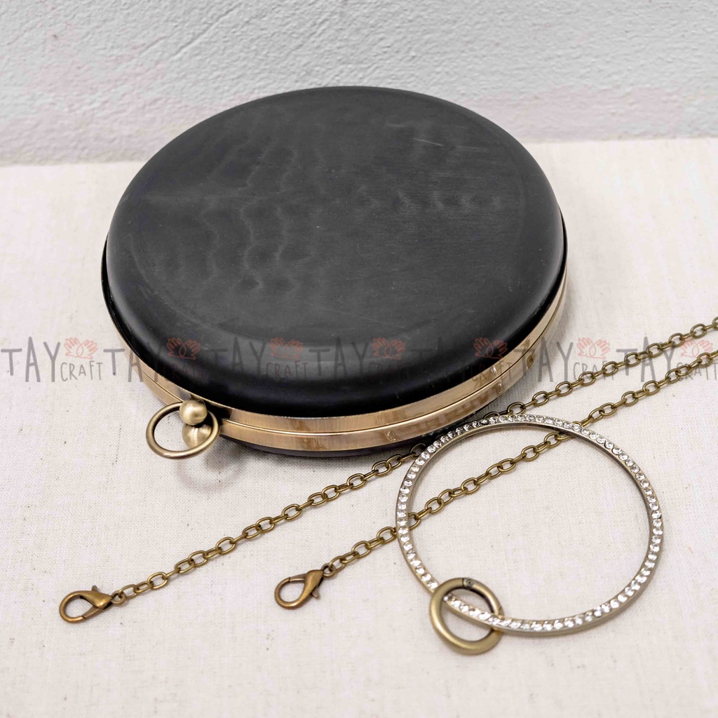 - Bộ sản phẩm bao gồm: 1 phôi hộp tròn trơn (gồm 2 mặt hộp nhựa và 1 khung viền kim loại) + 1 dây xích đeo vai + 1 tay cầm hình tròn đính đá