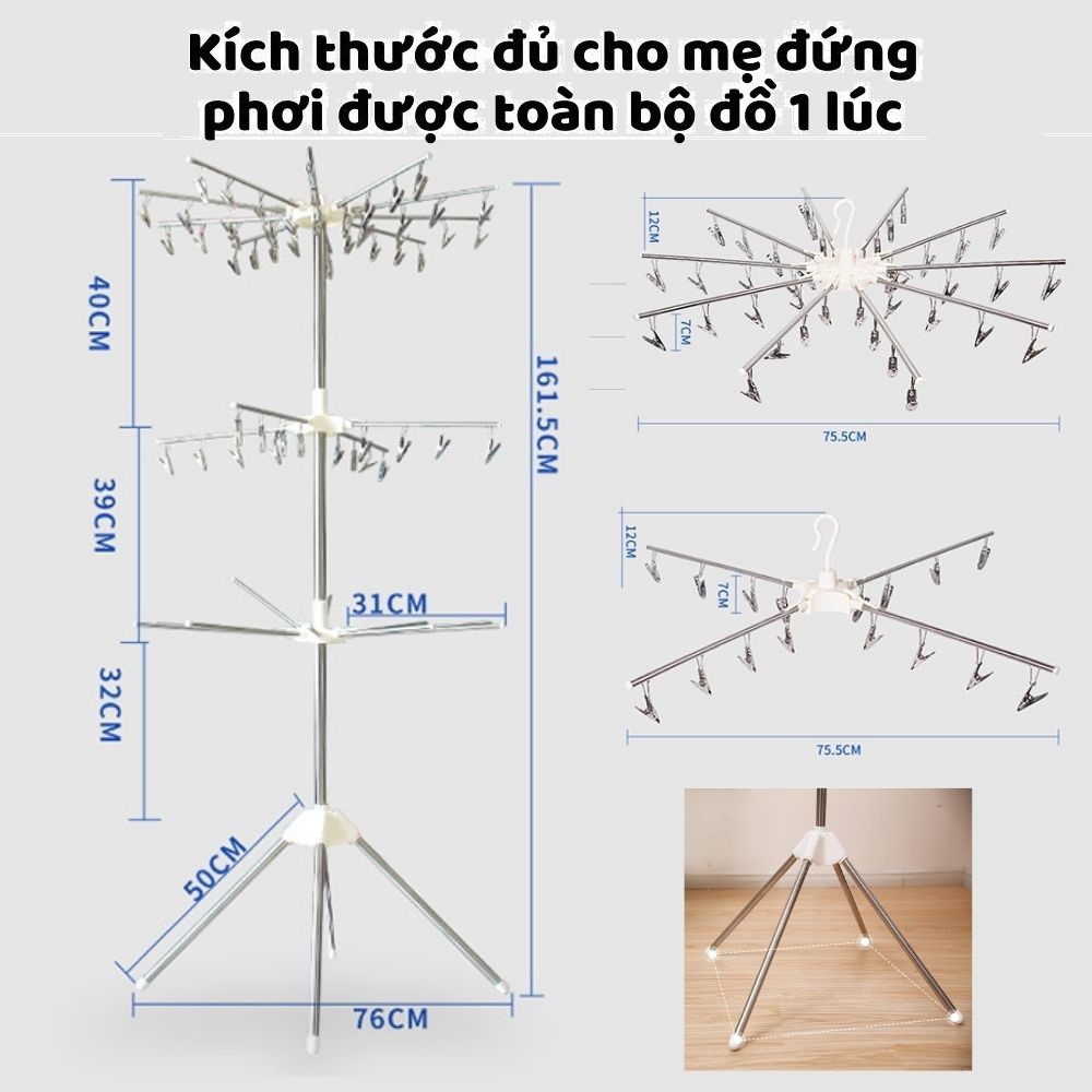 Cây phơi quần áo inox gấp gọn 3 tầng 56 kẹp móc quần áo cho trẻ sơ sinh
