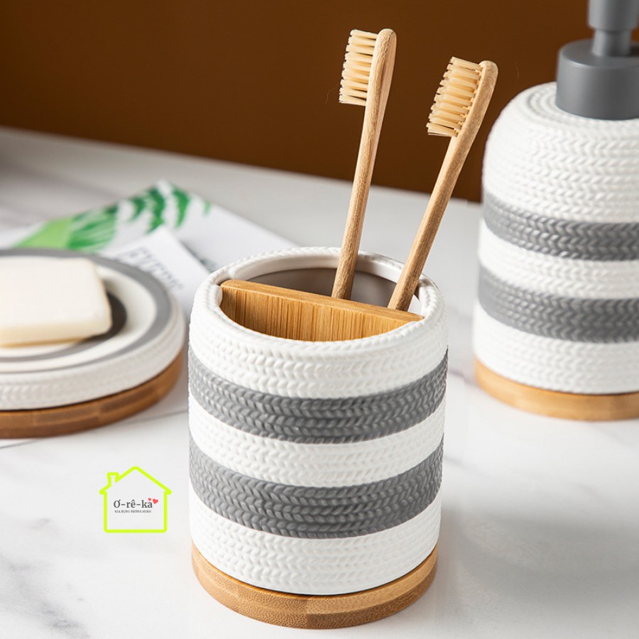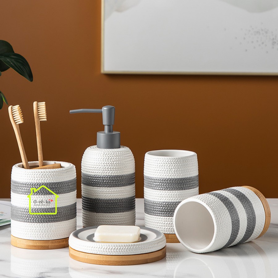 Đồ dùng phòng tắm 5 món Bosilun bằng sứ đẹp, set đồ dùng nhà tắm đựng bàn chải, xà phòng, cốc súc miệng - Oreka