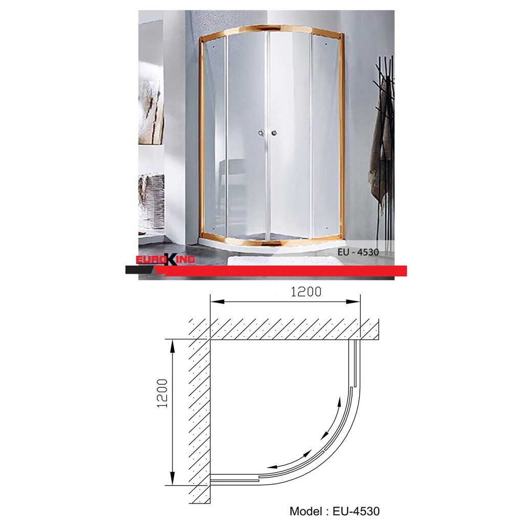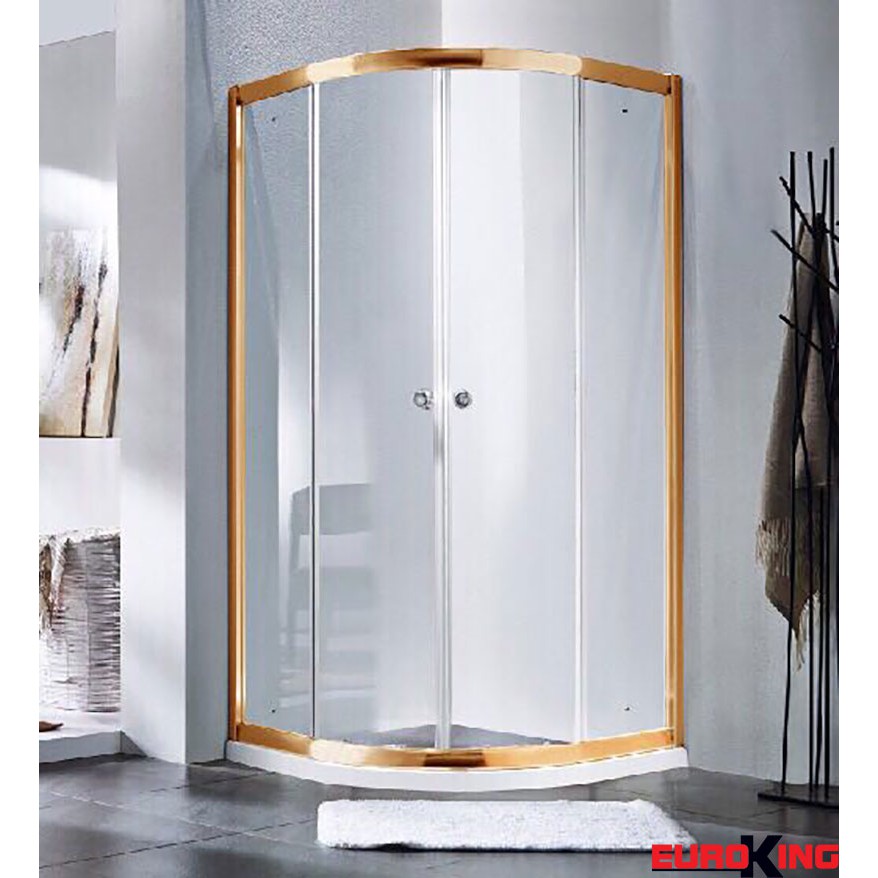 Phòng tắm vách kính EuroKing EU – 4530 khác biệt với thiết kế hình bán nguyệt, bao quanh là lớp kính cường lực trong suốt, mở rộng tầm nhìn trong mọi không gian. Bộ khung sáng bóng ánh vàng kim loại tạo thành điểm nhấn ấn tượng, sang trọng cho phòng tắm.