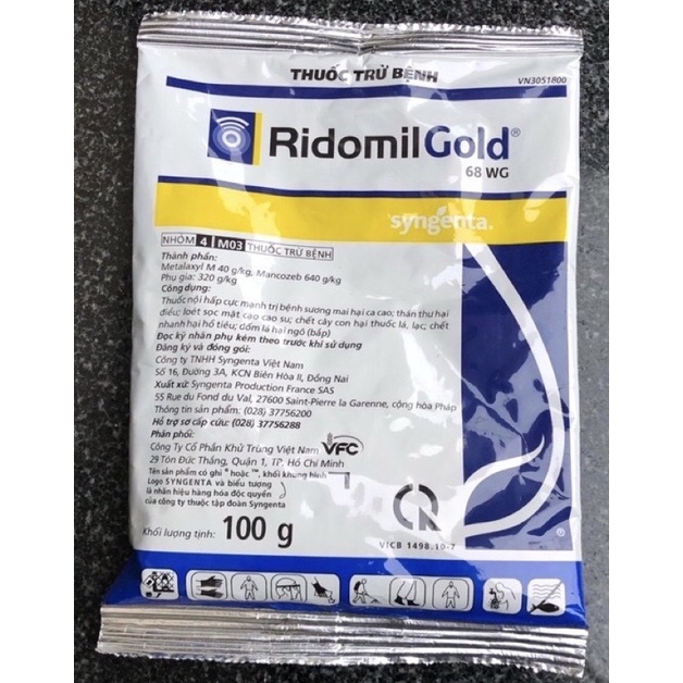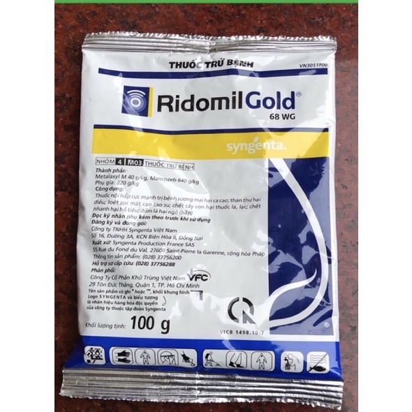Nhà sản xuất: Syngenta.RIDOMIL GOLD 68WG là dạng bột pha nước cực mạnh trị vàng lá, đốm lá, sương mai, thán thư, loét sọc mặt trên các loại cây lương thực như lúa, ngô... cây công nghiệp như chè, cà phê, cao su, hồ tiêu,…. phòng trừ nấm cho các loại cây ăn quả và hoa cảnh, đặc biệt là hoa hồng, dạ yên thảo, dừa cạn. Trừ héo rũ do nấm gây ra.