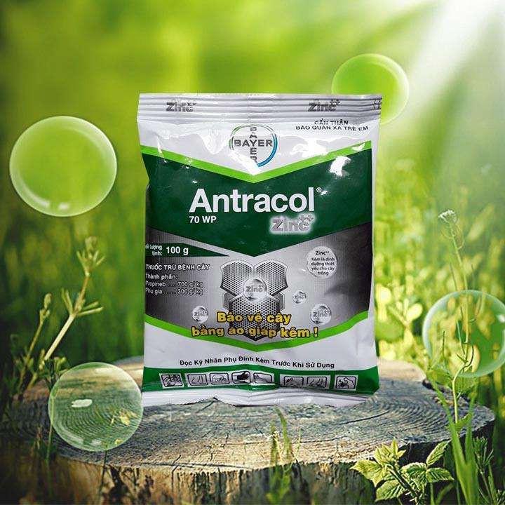 Antracol phòng trừ nấm bệnh 100g- Phòng trừ bệnh phổ rộng, dạng bột thấm nước, có độ phủ tốt và có độ bám dính cao trên bề mặt lá khi phun, còn cung cấp vi lượng kẽm(Zn++) cho cây trồng giúp phát triển xanh tốt, tăng năng suất và chất lượng nông phẩm.