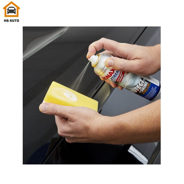 Lắc đề và xịt Phủ Bóng Bảo Vệ Sơn Sonax XTreme Protect Shine Hybrid NPT 210ml 222100 lên một miếng mút khô chuyên dụng.