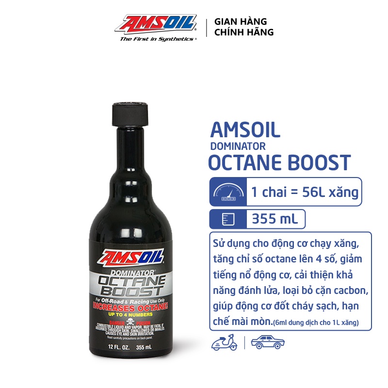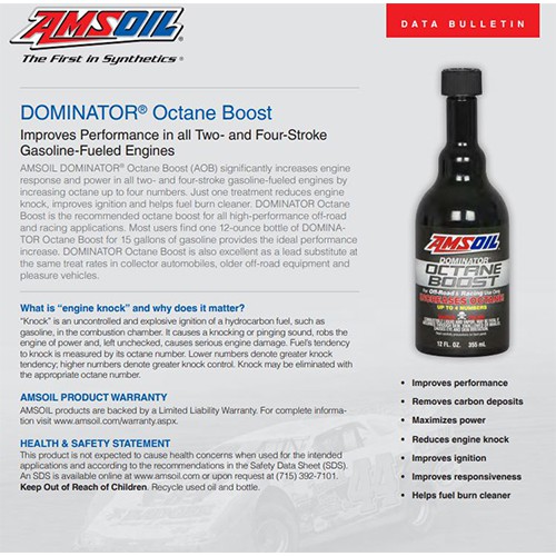 AMSOIL DOMINATOR® Octane Boost (AOB) làm tăng đáng kể phản ứng và công suất của động cơ trong tất cả các động cơ xăng hai và bốn thì bằng cách tăng chỉ số octan lên đến bốn con số. Chỉ cần một lần xử lý sẽ làm giảm tiếng ồn động cơ, cải thiện khả năng đánh lửa và giúp nhiên liệu đốt sạch hơn. DOMINATOR Octane Boost là mức tăng chỉ số octan được khuyến nghị cho tất cả các ứng dụng địa hình và đua xe thể thao. Hầu hết người dùng nhận thấy một chai DOMINATOR Octane Boost 12 ounce(= 354.882ml) cho 15 gallon (=56.7812Lít) xăng giúp tăng hiệu suất lý tưởng. DOMINATOR Octane Boost cũng tuyệt vời như một chất thay thế chính ở mức độ xử lý tương tự trong bộ sưu tập ô tô, thiết bị địa hình cũ hơn và xe vui chơi.