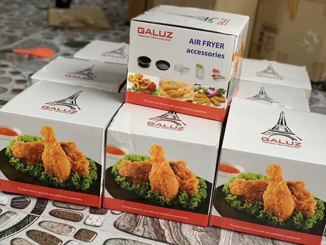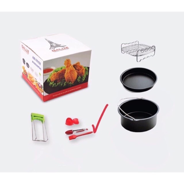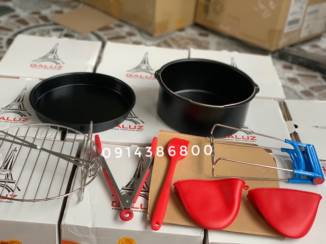 Giới thiệu Bộ phụ kiện 7 món (5 món) nồi chiên không dầu Galuz, tiện lợi cho làm bánh, nướng nhiều tầng, nướng pizza...