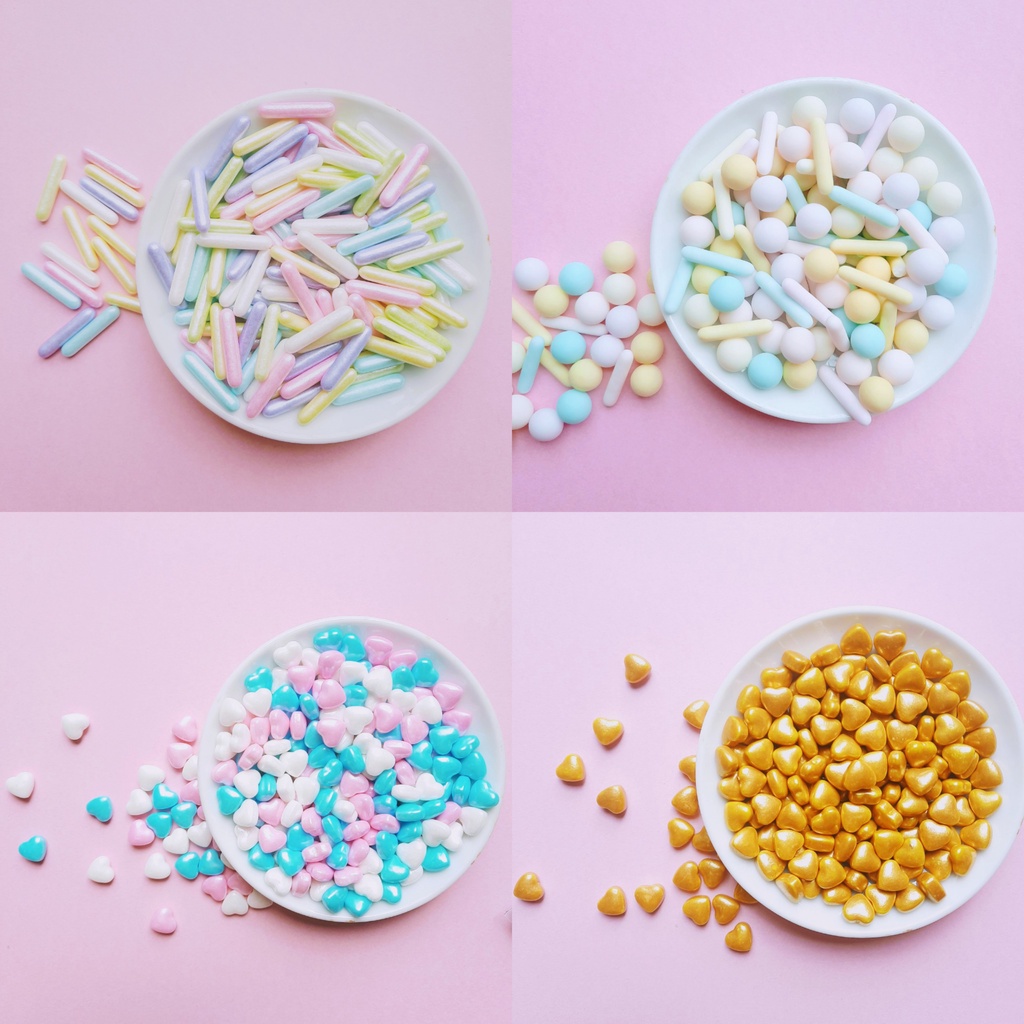 - Xuất sứ: Phụ kiện bánh sinh nhật bánh kem - 120g bi đường tròn, dài, tim, sao nhiều màu lì, bóng