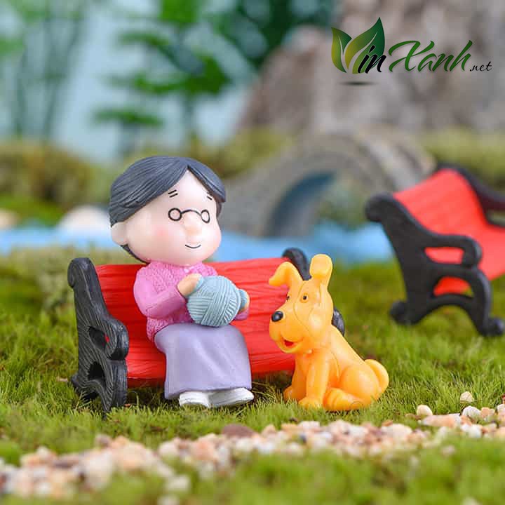 Phụ kiện cặp đôi mô hình ông bà lão ngồi ghế đỏ trang trí nhà cửa bàn học cây xanh.