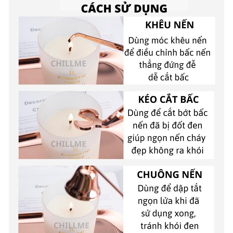 Bộ phụ kiện chăm sóc nến thơm cao cấp 3 món gồm khêu, chuông, kéo cắt bấc nến kim loại không gỉ chillmeVẬT LIỆU: Thép không rỉ