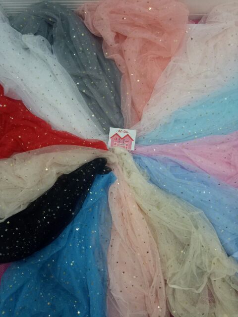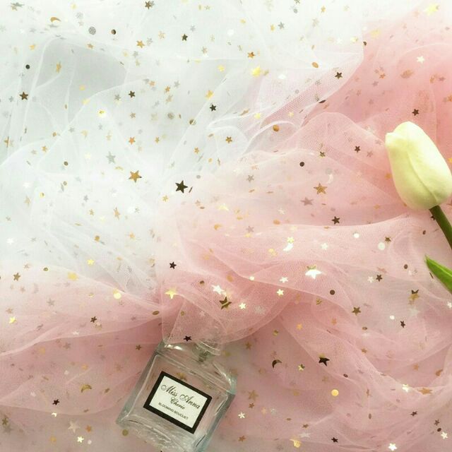 🍀 Vải voan kim tuyến chụp ảnh, được đính những ngôi sao, trăng nhỏ nhỏ xynh xynh màu vàg đồng lấp lánh🍀 Vải voan mềm mịn, sờ cực thích luôn, không phải loại voan cứng đâu ạ.