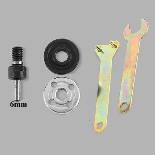 Bộ phụ kiện bao gồm: 2 Vòng siết để giữ đĩa cắt, 2 khóa để mở, 1 trục chuyển, Lưu ý: lắp tay cầm phụ cho khoan để dễ thao tác, tay cầm chắc chắn, kẹp vật cắt hay mài chắc chắn trước khi thao tác sử dụng.