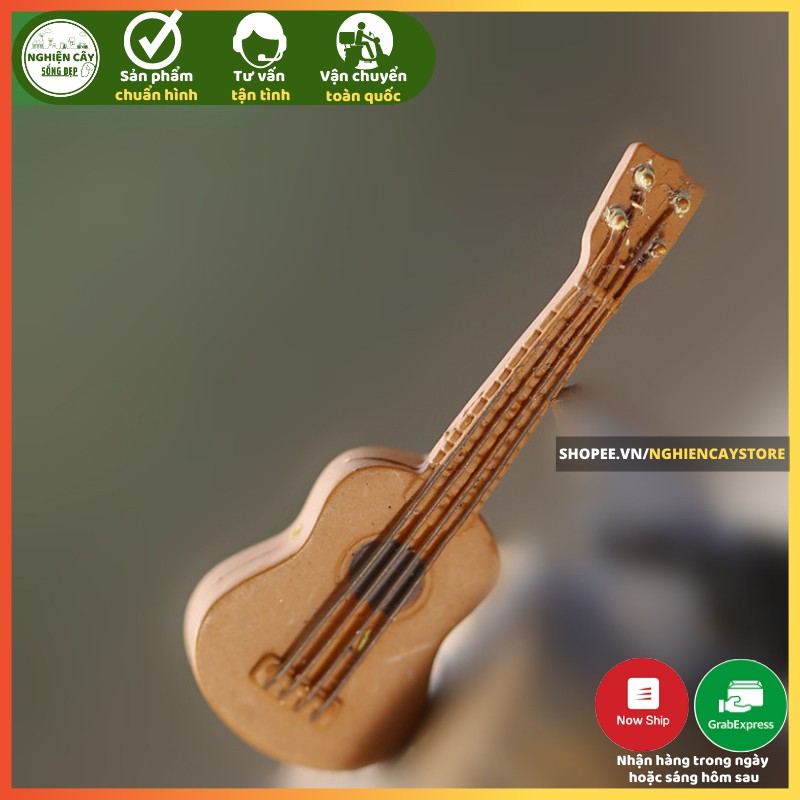 Phụ kiện tiểu cảnh đàn ghita là phụ kiện không thể thiếu trong quá trình trang trí tiểu cảnh, tạo các tác phẩm terrarium đẹp mắt. Tạo cảnh quan sinh động hơn cho tác phẩm vi mô của bạn. Đồng thời cũng có thể sử dụng để trang tri cho những chậu cây để bàn. Giá thành sản phẩm rẻ, dễ trang trí, phù hợp với nhiều đối tượng khách hàng – học sinh, sinh viên, nhân viên văn phòng …