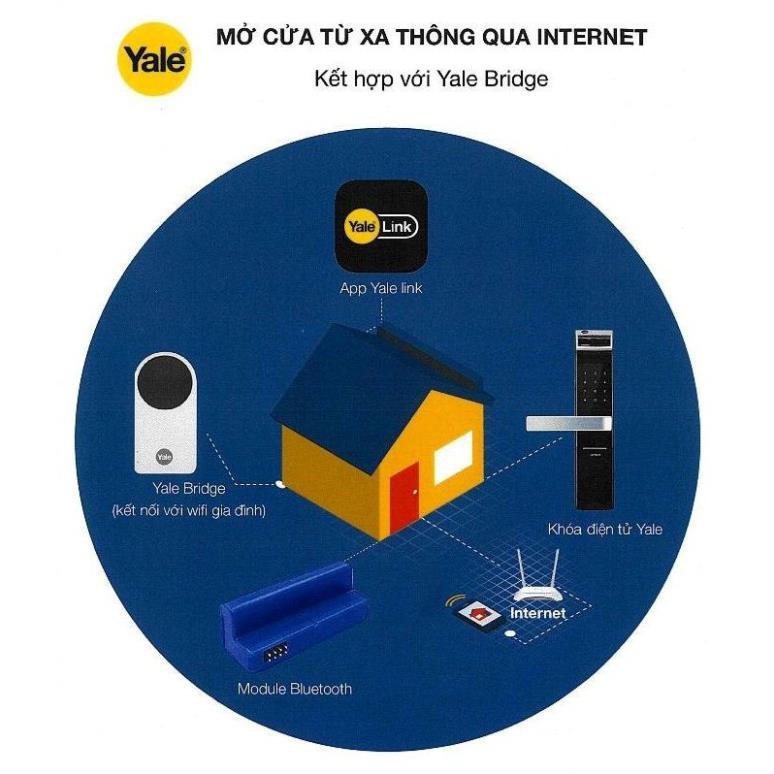 Phụ kiện Yale link bridge tích hợp vào hệ thống để mở khóa điện tử Yale từ bất cứ nơi nào trên thế giới.Dùng app Yale link trên smartphone: để cài đặt người sử dụng; nhận thông báo khi có người mở khóa, khi có hiện tượng phá khóa; xem lịch sử ra vào