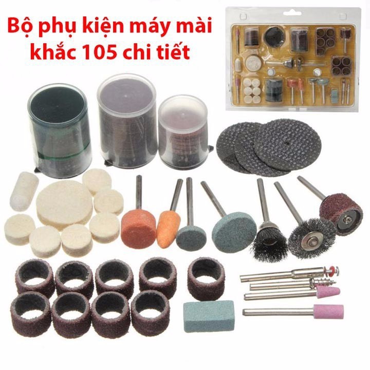 - Với 105 chi tiết của trên 10 loại công cụ khác nhau, bộ phụ kiện máy mài khắc này có thể đáp ứng mọi nhu cầu về mài, khắc đánh bóng trong quá trình gia công chế tác.