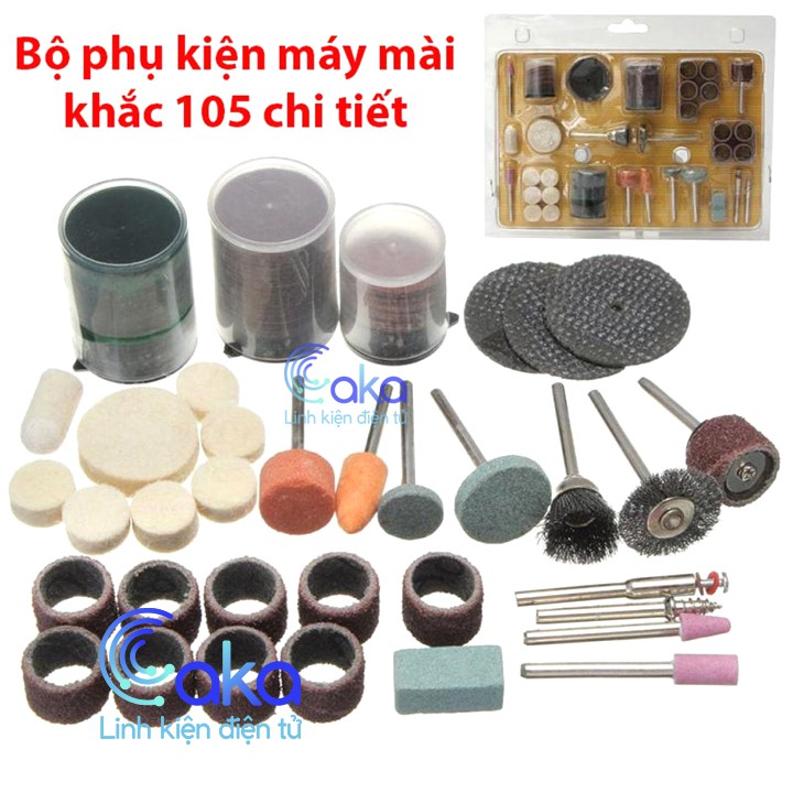 - Với 105 chi tiết của trên 10 loại công cụ khác nhau, bộ phụ kiện máy mài khắc này có thể đáp ứng mọi nhu cầu về mài, khắc đánh bóng trong quá trình gia công chế tác.