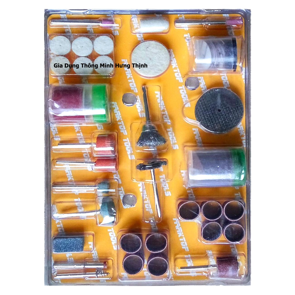 Bộ phụ kiện máy khoan, mài, khắc đa năng: Bộ phụ kiện gồm 105 chi tiết lớn nhỏ. Là bộ phụ kiện hỗ trợ đắc lực cho các bác làm điêu khắc. Làm lũa gỗ, khoan, khắc, mài các vật kích thước nhỏ, yêu cầu độ chính xác cực cao. Trên các loại chất liệu: đá, kính, kim loại, nhựa, gỗ, phi kim…