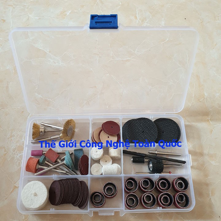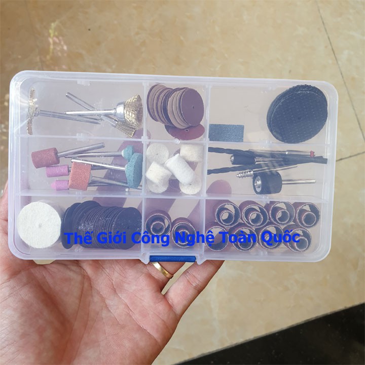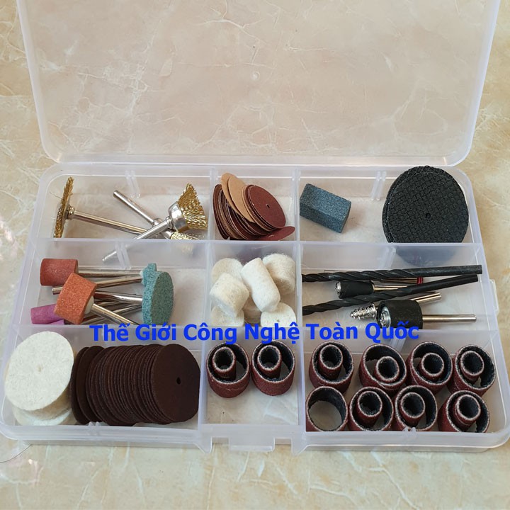Bộ phụ kiện 105 chi tiết khoan, mài, khắc, đánh bóng đa năng hàng hộp cao cấpBộ phụ kiện gồm 110 chi tiết lớn nhỏ. Là bộ phụ kiện hỗ trợ đắc lực cho các bác làm điêu khắc, làm lũa gỗ, khoan, khắc, mài các vật kích thước nhỏ, yêu cầu độ chính xác cực cao, trên các loại chất liệu: đá, kính, kim loại, nhựa, gỗ, phi kim…
