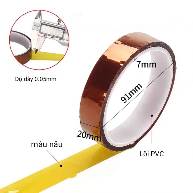 Tên sản phẩm; băng dính nhiệt độ caoKích thước sản phẩm; 20 mm (chiều rộng) * 33m (chiều dài)